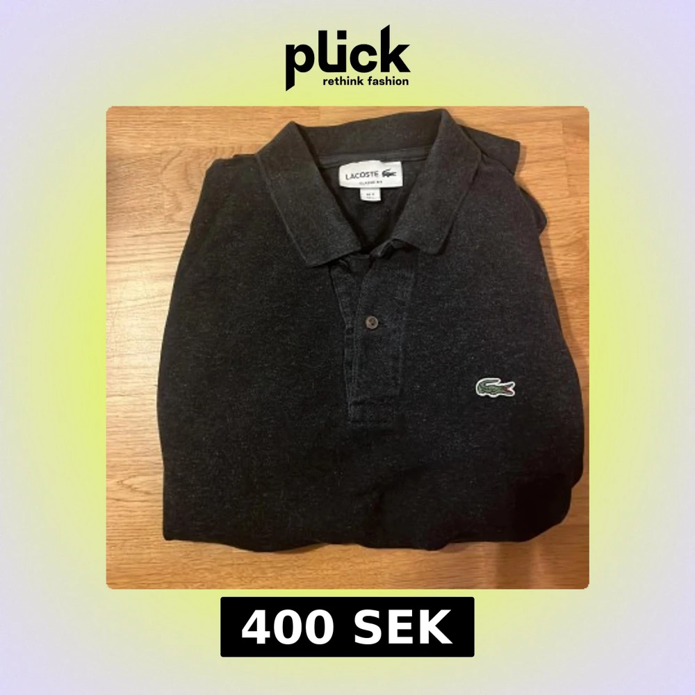 Klassisk svart långärmad pikétröja från Lacoste i storlek M. Tröjan har krage, knäppning framtill och den ikoniska gröna krokodilloggan broderad på bröstet. Perfekt för en clean och stilren look.