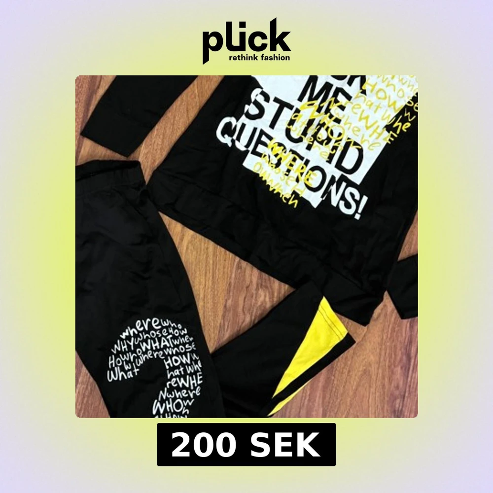 Svart långärmad pyjamas med stort grafiskt tryck i vitt och gult framtill med texten 'DON'T ASK ME STUPID QUESTIONS!' och ord i olika stilar. Tröjan har gula detaljer vid axlarna och är i mjukt material, perfekt för en avslappnad och cool look.