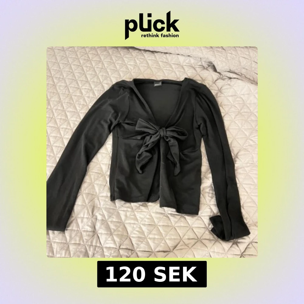 Snygg svart långärmad topp från Gina Tricot med en stor knytrosett framtill. Perfekt för en stilren look. Toppen har en djup v-ringning och är tillverkad i ett mjukt material.