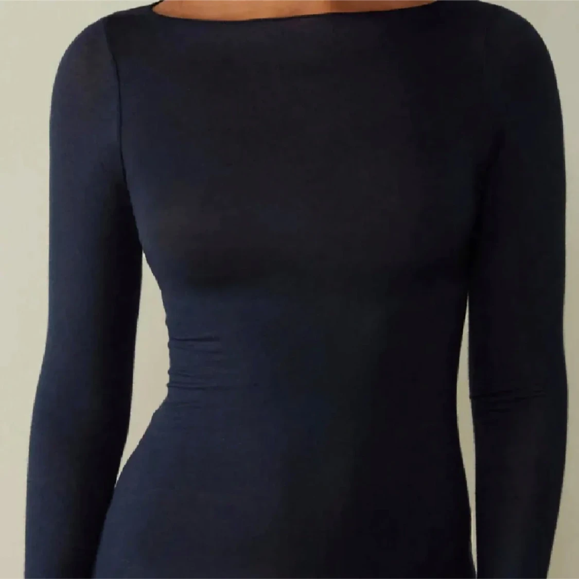 En blå långärmad topp med båtringning. Tight passform som framhäver figuren och passar perfekt till både jeans och kjol. Enkel och tidlös design som är lätt att matcha med olika outfits.