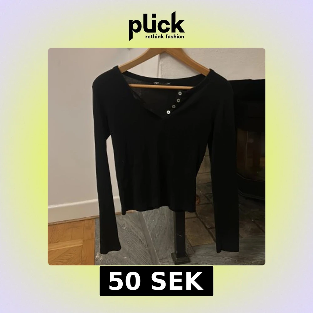 Snygg svart långärmad topp från Zara med knappar vid halsringningen. Sitter väldigt fint på. Säljer då den är lite för liten. Storlek s. Har ett väldigt mjukt material och sitter ganska tajt.