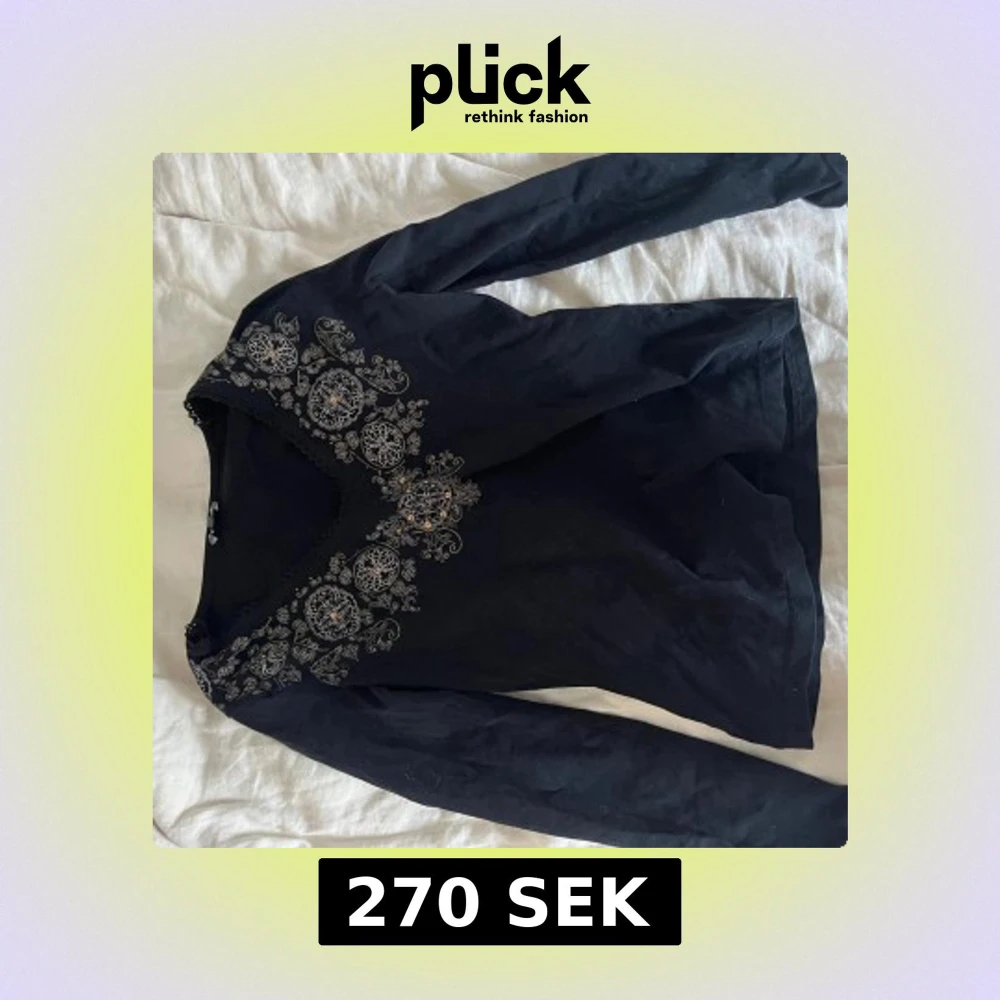 Säljer en svart långärmad topp med v-ringning och detaljerat vitt broderi framtill. Perfekt för dig som vill ha något unikt och snyggt i garderoben. Passar till många olika stilar!