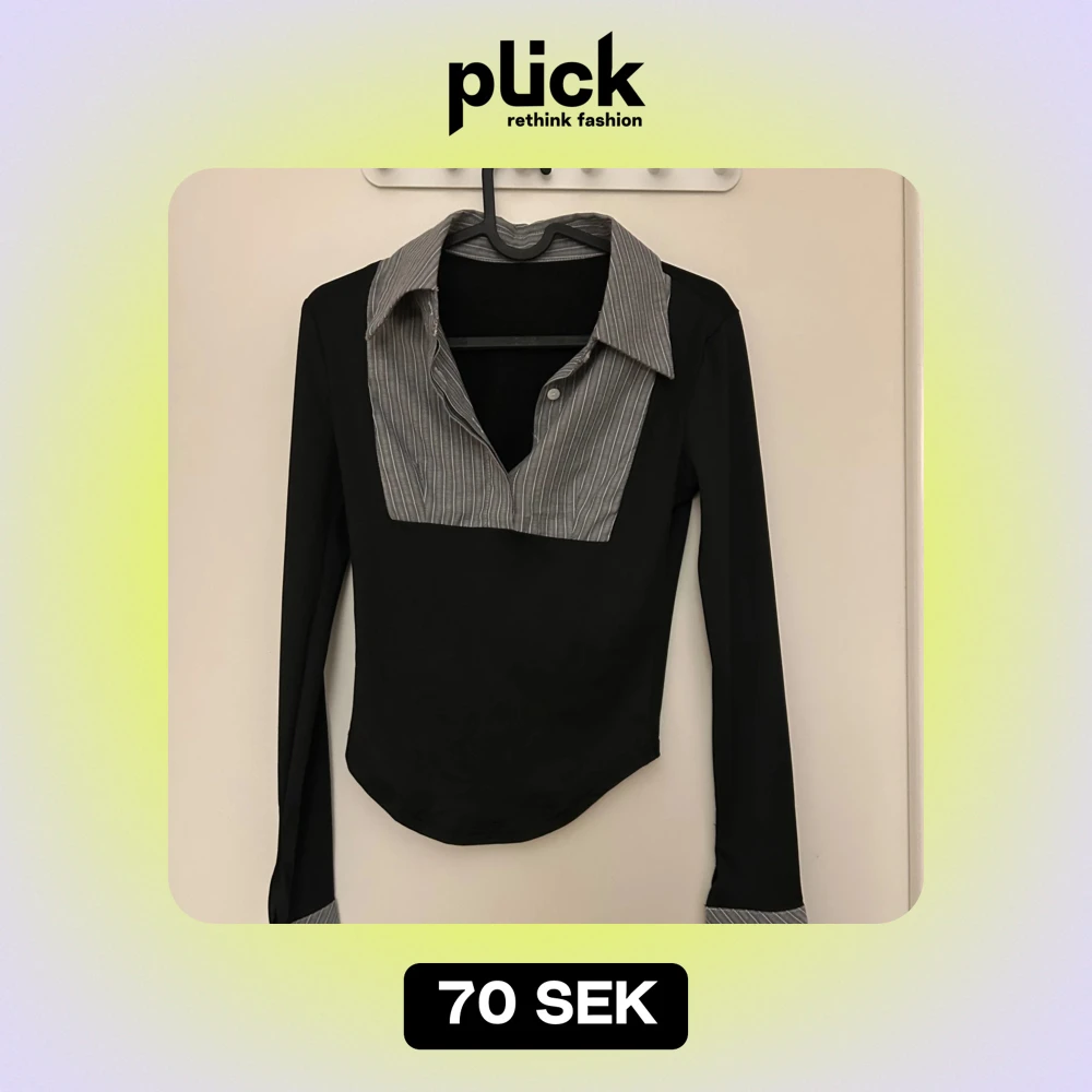 Säljer en stilren svart långärmad topp med en snygg randig krage och manschetter. Perfekt för både vardag och fest! Materialet känns mjukt och bekvämt. Passar bra till jeans eller kjol för en chic look. Hör av dig vid intresse! 🖤