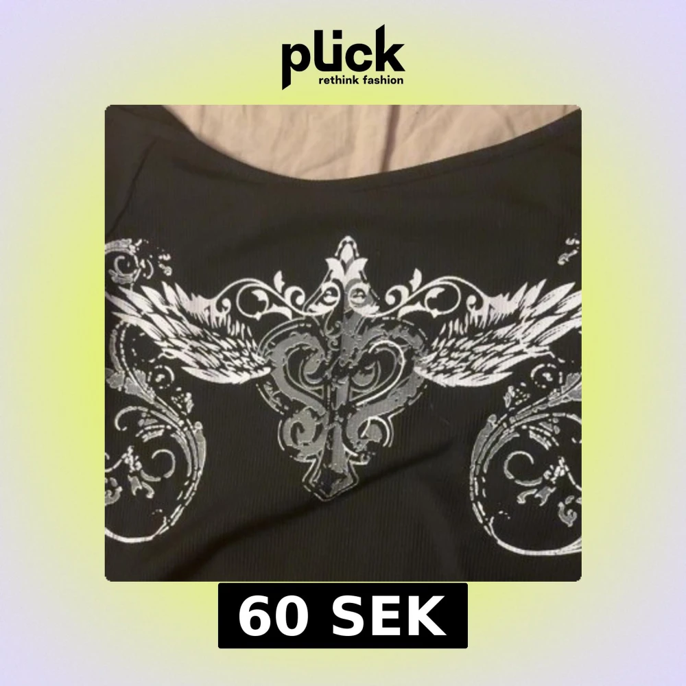 Svart långärmad topp med stort silvrigt tryck framtill som har vingar och ornament. Trycket fortsätter även på ena ärmen. Toppen har en något bredare halsringning och är figurnära i modellen. Perfekt för dig som gillar edgy och unika detaljer.