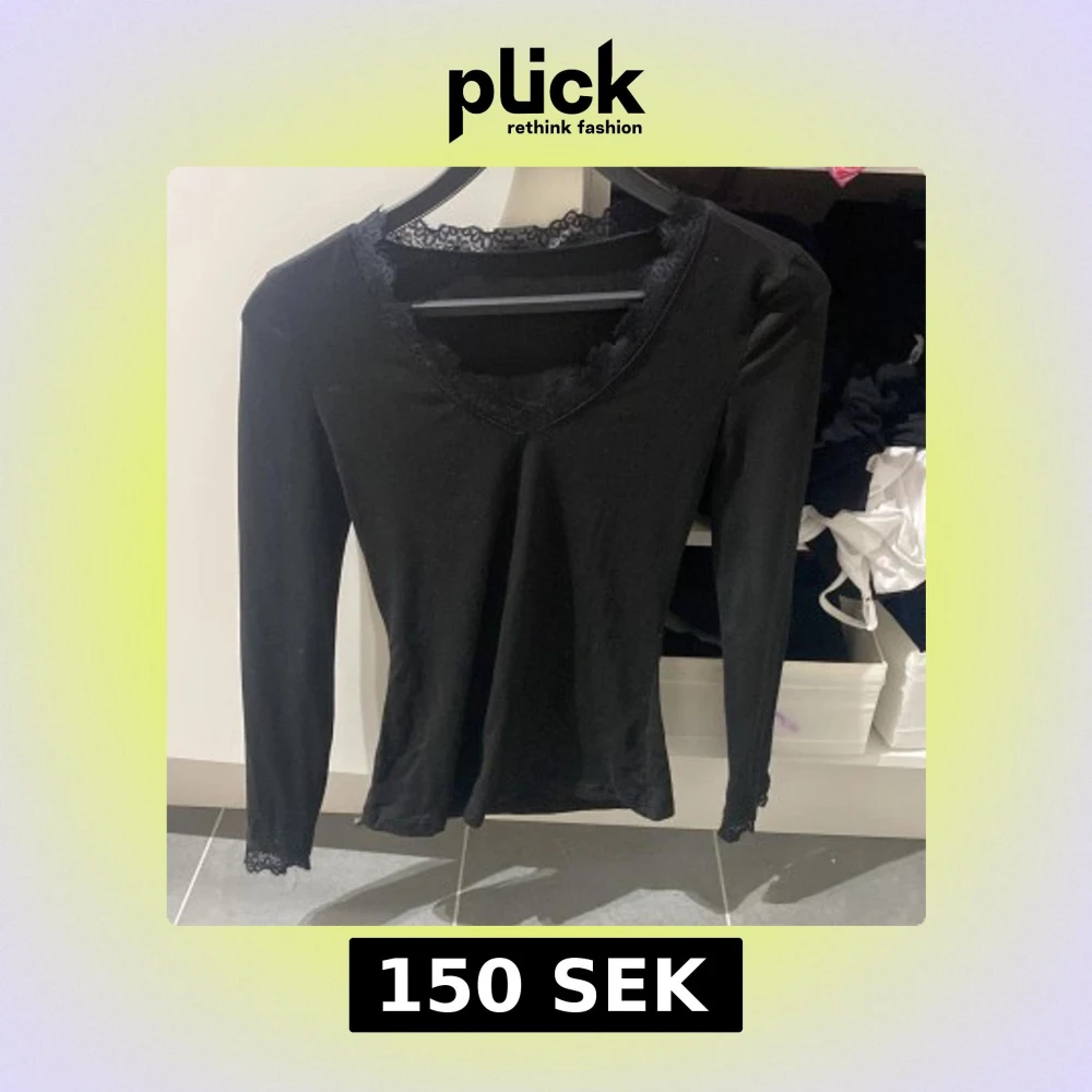 Svart långärmad topp med v-ringning och fina spetsdetaljer vid halsringningen och ärmsluten. Snygg och enkel modell som passar perfekt till jeans eller kjol. Mjuk och stretchig känsla för en bekväm passform.