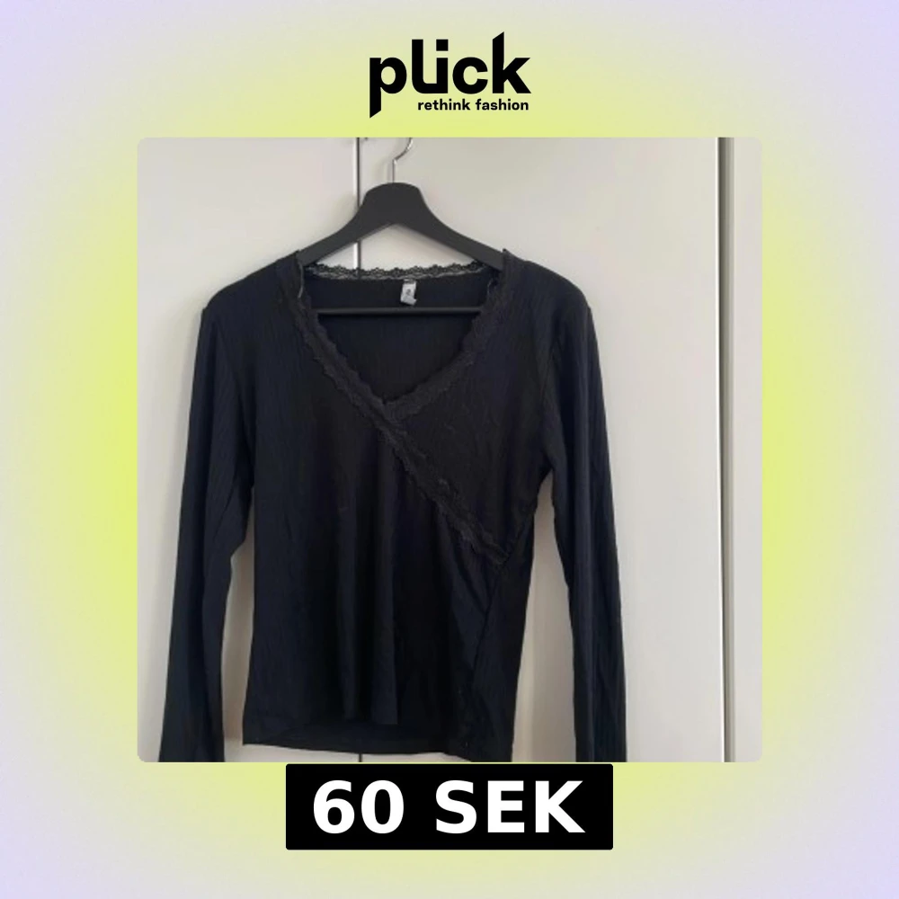Snygg svart långärmad topp med spetsdetaljer vid halsringningen. Perfekt för en stilren look. Toppen har en omlott-design framtill som ger en elegant touch.