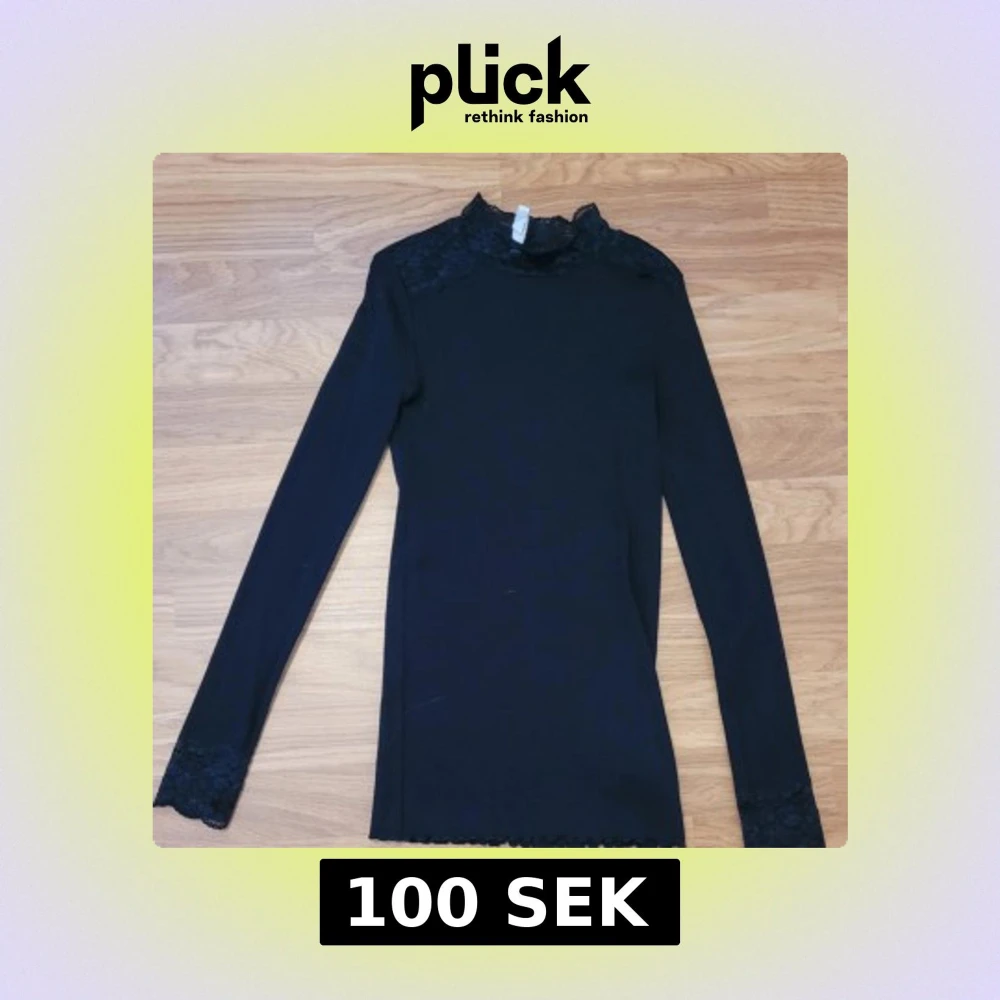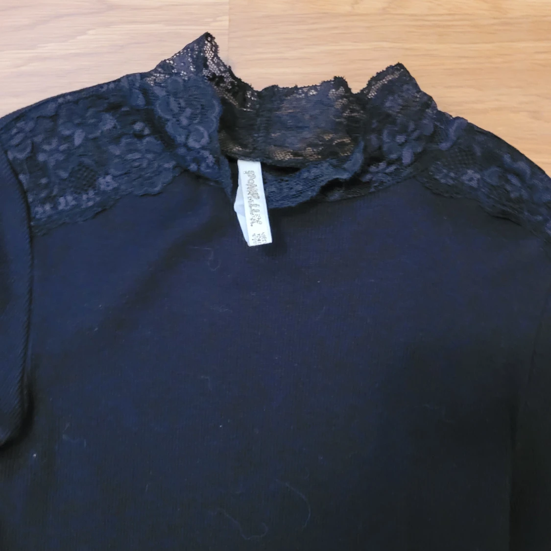 Säljer en svart långärmad topp från Pomp de lux med fina spetsdetaljer vid halsringningen och axlarna. Perfekt att styla till olika outfits och ger en elegant touch med den höga spetskragen.