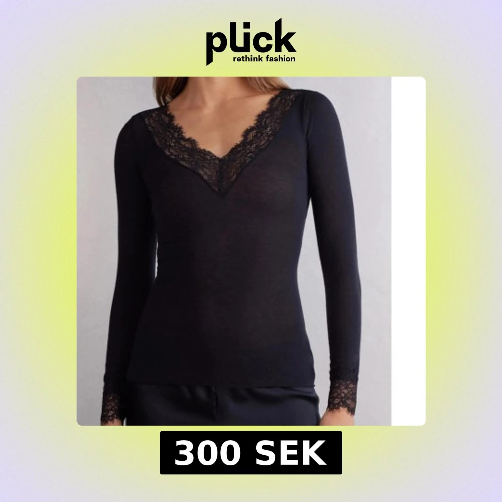 Elegant svart topp med v-ringning och spetsdetaljer vid hals och ärmslut. Perfekt för en stilren look.
