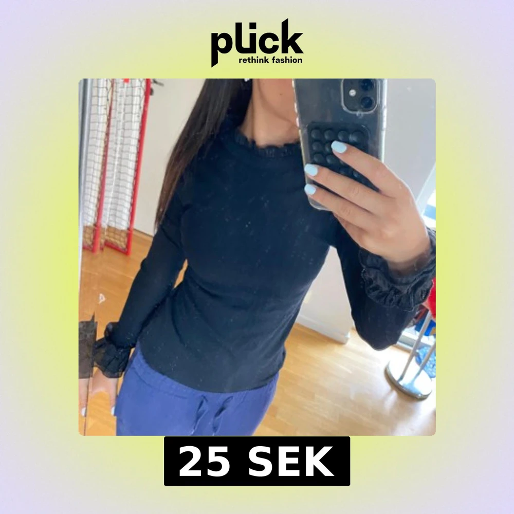 Svart långärmad topp med volangdetaljer vid halsringning och ärmslut. Sitter tight.