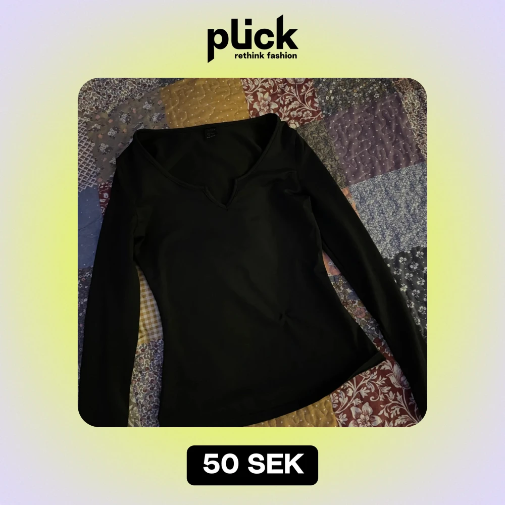 Säljer en stilren svart långärmad topp i mycket bra skick. Den har en snygg v-ringning . Materialet känns mjukt och bekvämt mot huden. Har ett litet hål som jag sytt igen på framsidan