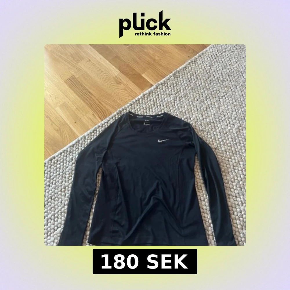 Säljer en svart långärmad träningströja från Nike med Dri-FIT-material. Perfekt för löpning eller gym, med diskret Nike-logga på bröstet. Tröjan är lätt och andas bra.
