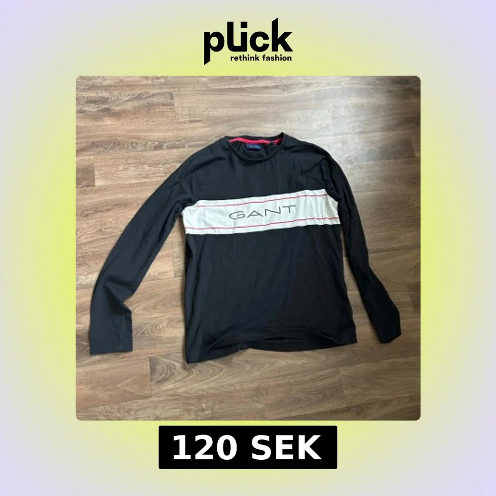 Säljer en stilren svart långärmad tröja från GANT med ett vitt och rött band över bröstet där märket är tryckt. Perfekt för en avslappnad stil. Tröjan har en rund halsringning och är gjord i ett mjukt material.