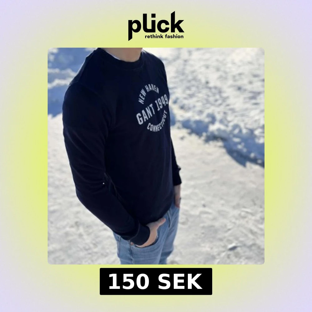Säljer en stilren svart långärmad tröja från GANT med tryck 'New Haven GANT 1949 Connecticut' på bröstet. Perfekt för en avslappnad look. Tröjan har ribbade muddar vid ärmslut och nederkant.