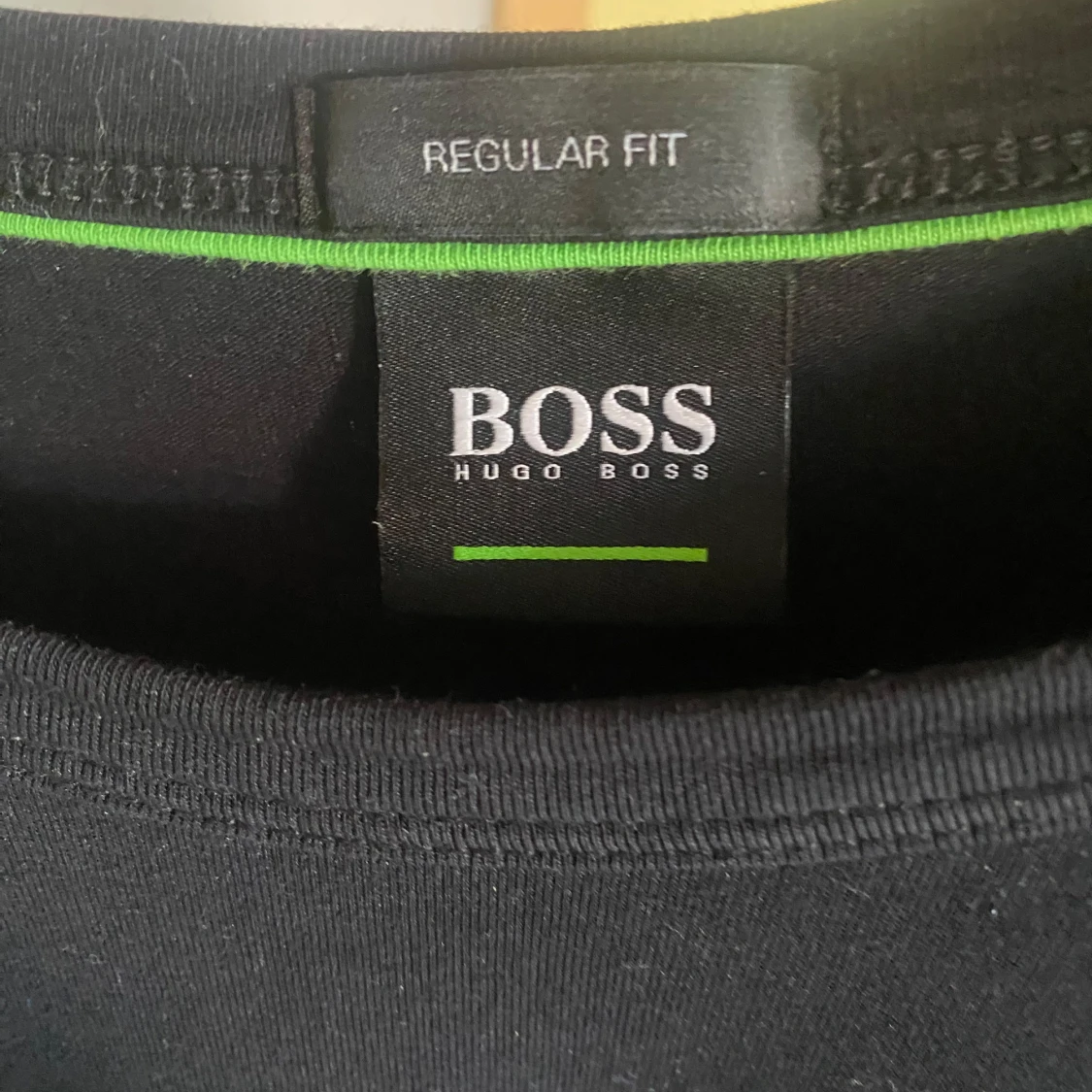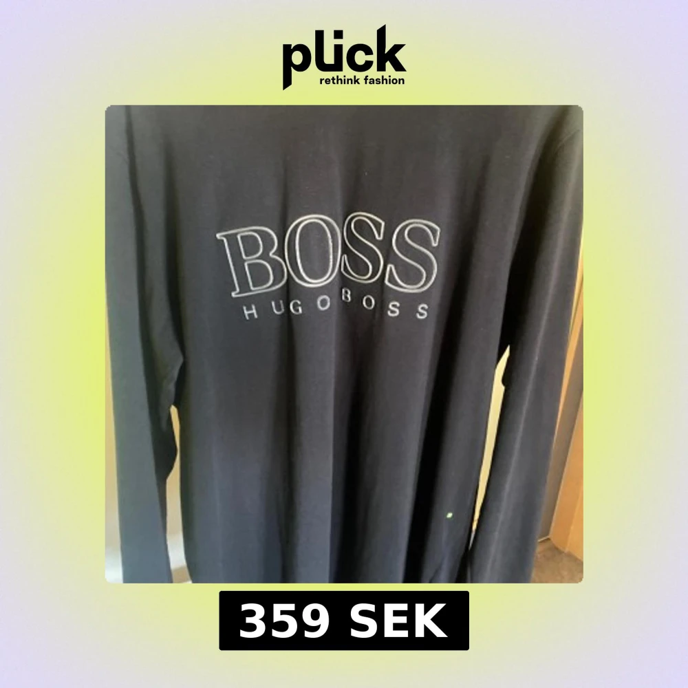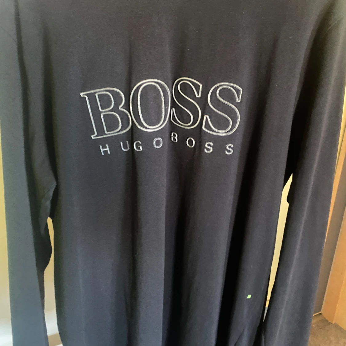 Säljer en svart långärmad tröja från Hugo Boss med stort BOSS-tryck på bröstet. Tröjan är i regular fit och tillverkad i mjuk bomull, perfekt för en stilren och enkel look.