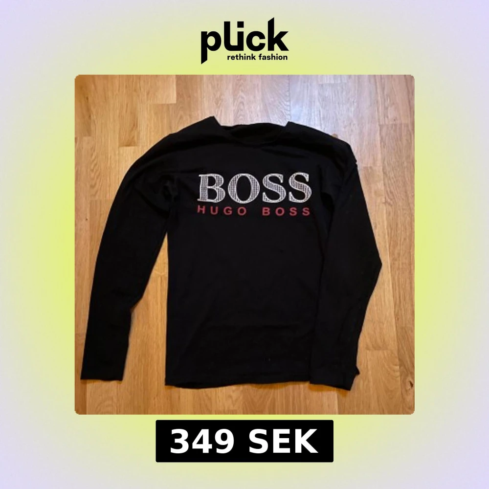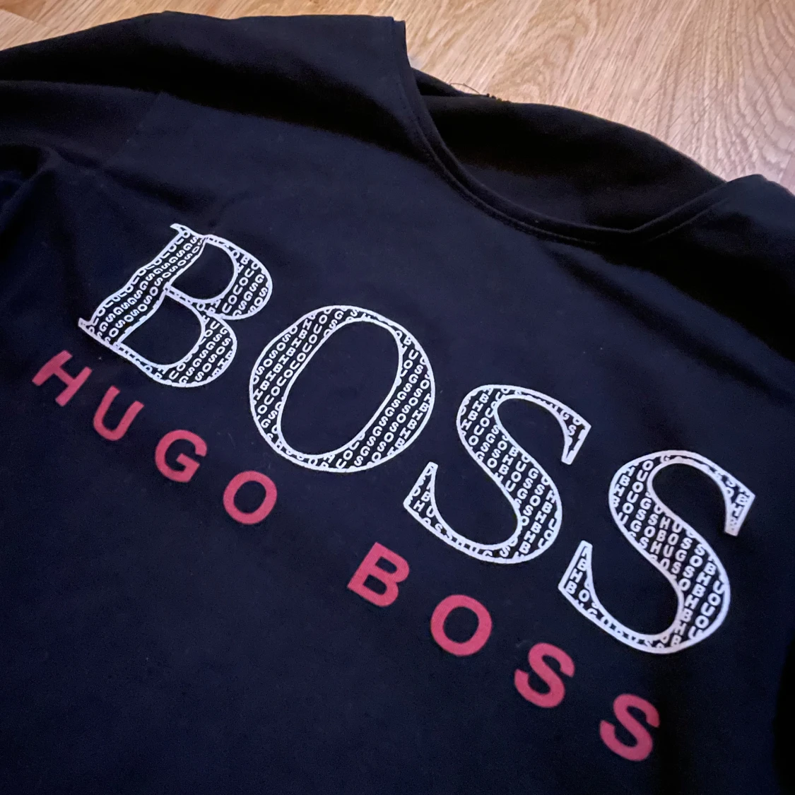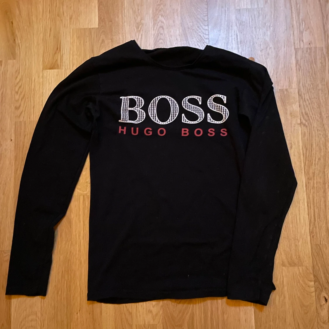 Snygg svart långärmad tröja från Hugo Boss med stort BOSS-tryck i vitt och rött på framsidan. Perfekt för en stilren och avslappnad look. I storlek S.