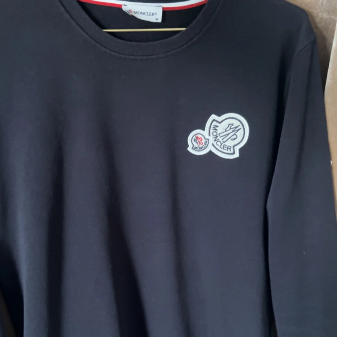 Svart långärmad tröja från Moncler med rund halsringning och snyggt broderat logomärke på bröstet. Tröjan har en stilren och enkel design som passar perfekt till jeans eller chinos. Materialet känns mjukt och bekvämt mot huden.