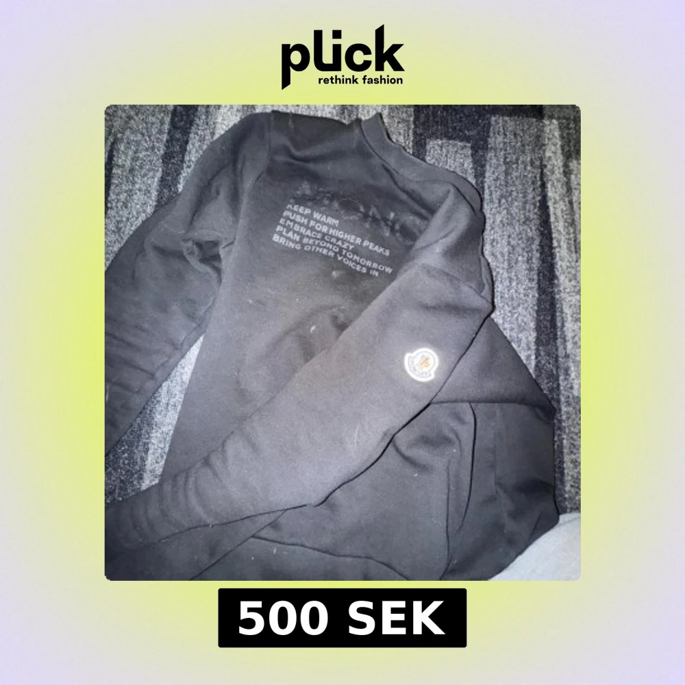 Säljer en svart långärmad tröja från Moncler med text på bröstet. Tröjan har en hög krage och Moncler-logga på ärmen. Perfekt för kyligare dagar.