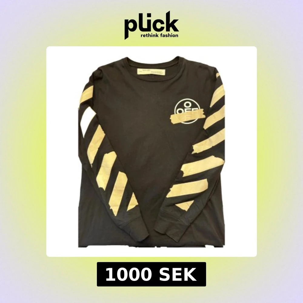 Svart långärmad tröja från Off-White med ikoniska beigea tejp-liknande ränder på ärmarna och stort korsmönster på ryggen. Rund halsringning och tryckt Off-White-logga framtill. Perfekt för dig som gillar streetwear och vill sticka ut.