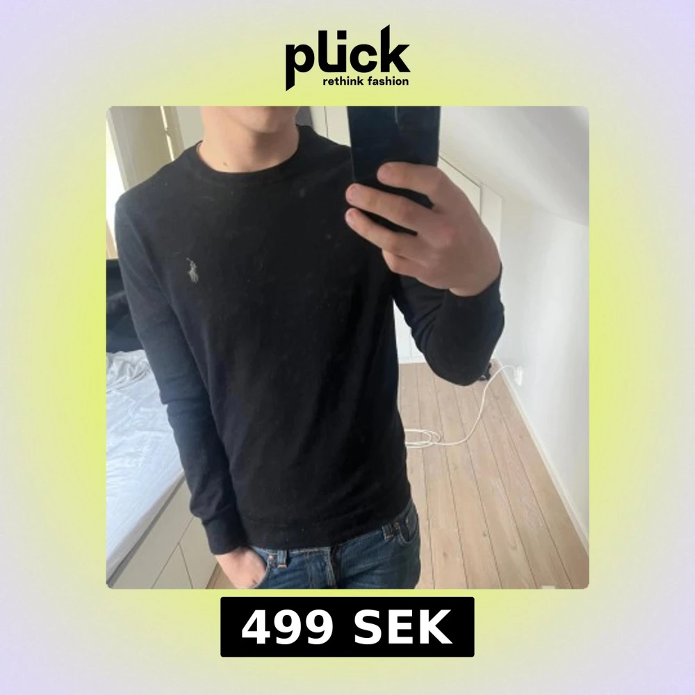 Svart långärmad tröja från Ralph Lauren med klassisk rund hals och den är i 100% merino ull och är extremt skön, sitter perfekt på mig och jag är runt 176 så är du runt där passar den dig har ett litet hål på armen