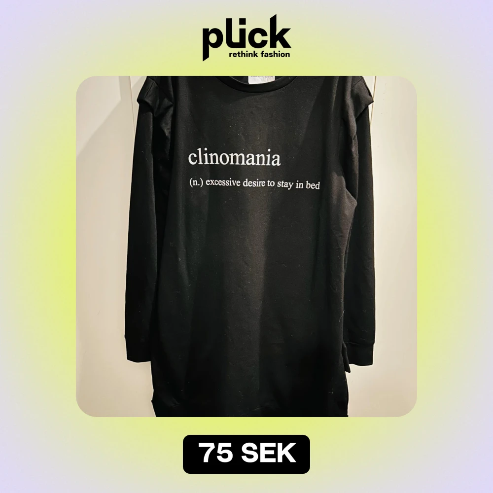 Säljer en svart långärmad tröja lite längre form från SHEIN med texten 'clinomania (n.) excessive desire to stay in bed' tryckt på framsidan. Perfekt för mysiga dagar hemma eller som en statement piece i garderoben. Tröjan är i bra skick och superbekväm. Passar perfekt till jeans eller leggings!