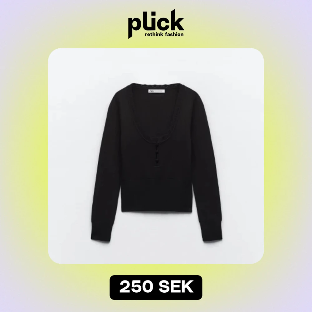 Säljer en snygg svart långärmad tröja från Zara. Tröjan har en djup v-ringning med knappar framtill och en fin spetsdetalj runt halsen. Perfekt för både vardag och fest! 🖤