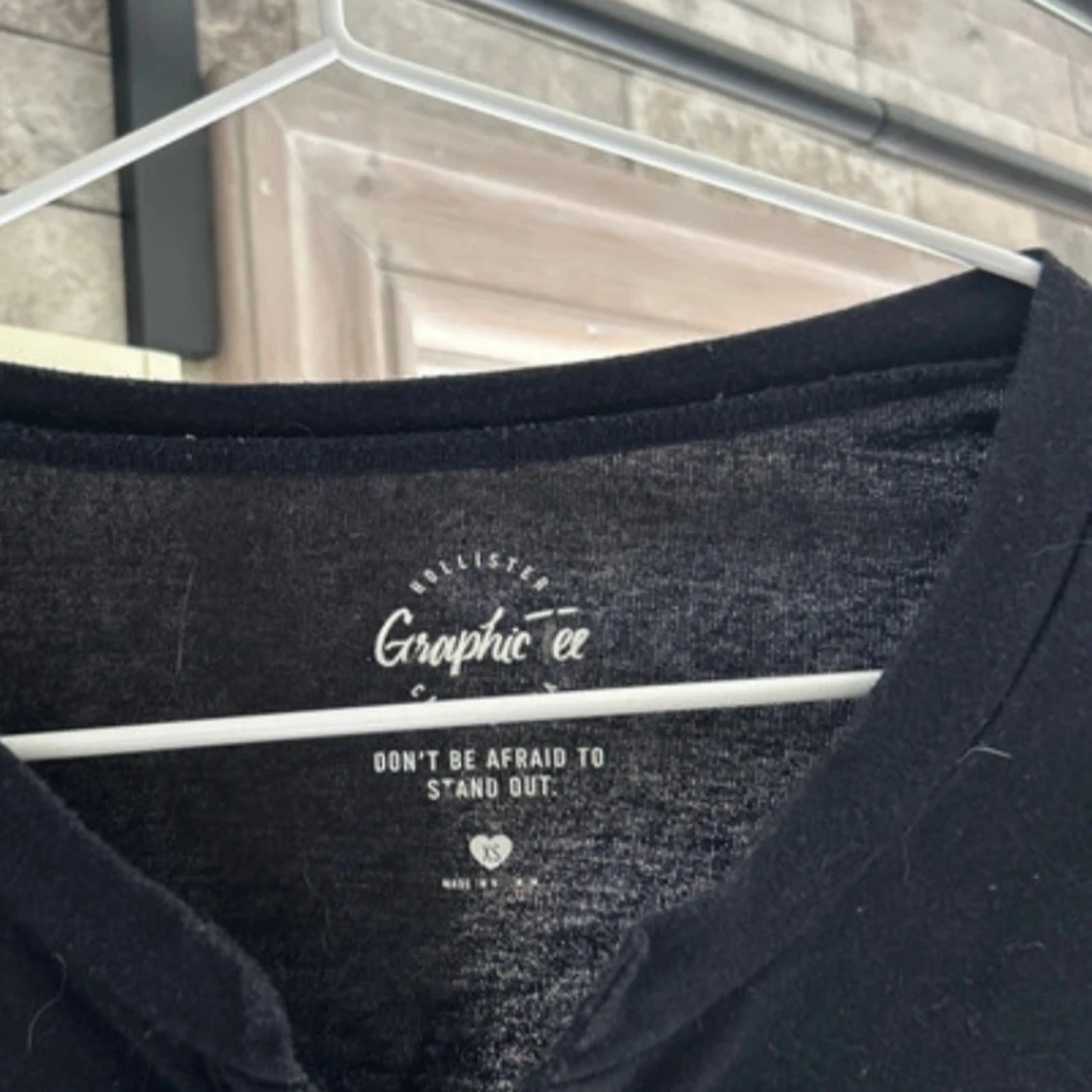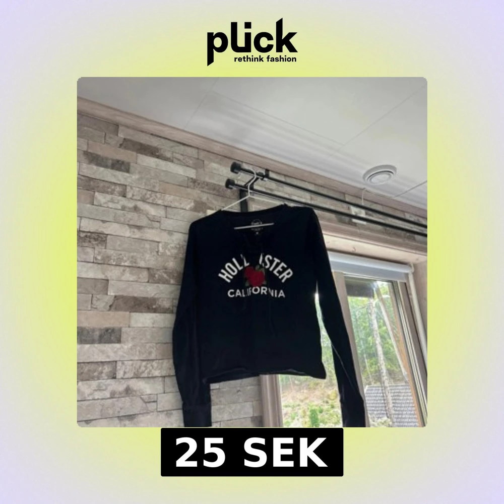 Svart långärmad tröja från Hollister med vit text och en röd ros broderad framtill. Tröjan har snörning vid halsen och en croppad passform. Perfekt för dig som gillar en avslappnad och trendig stil.