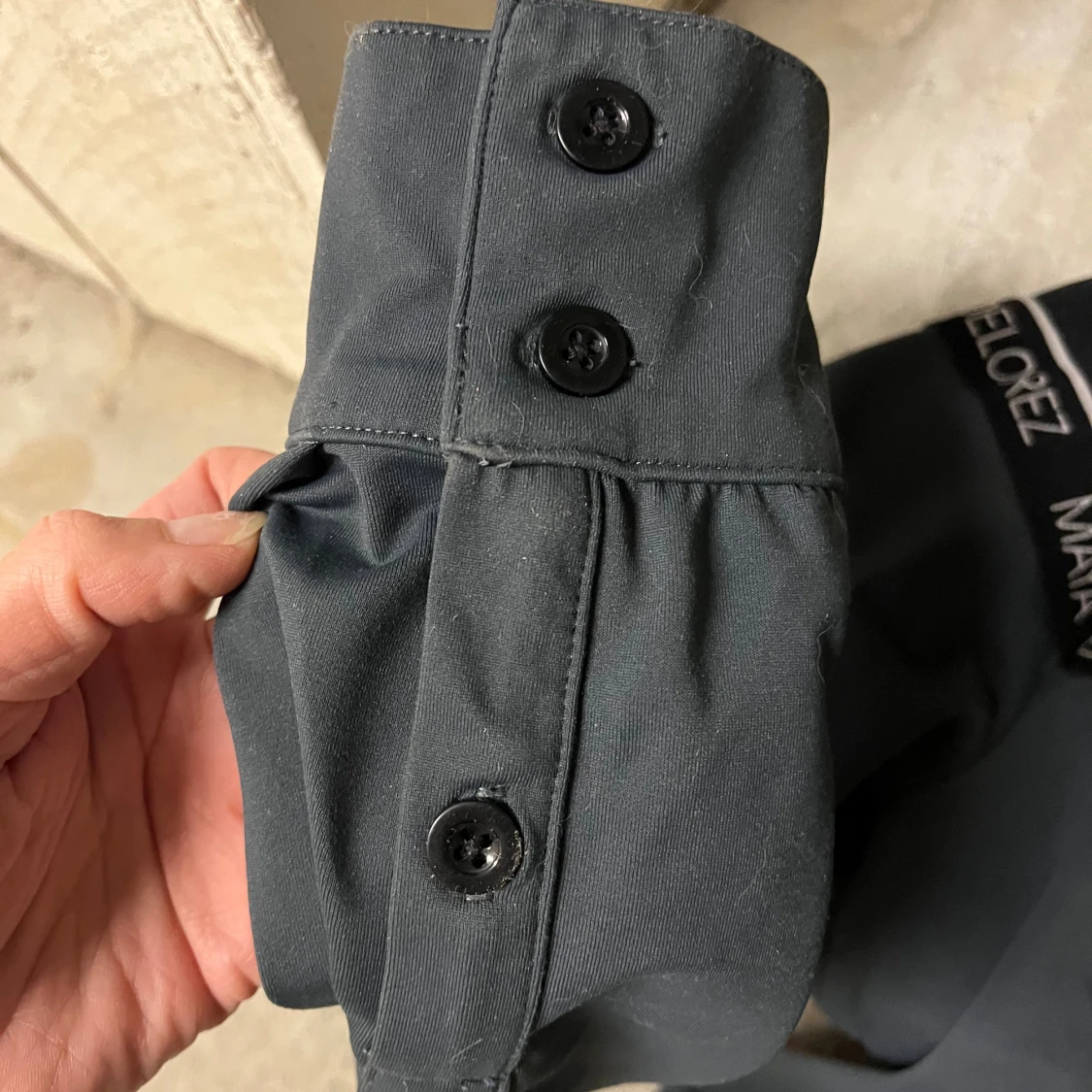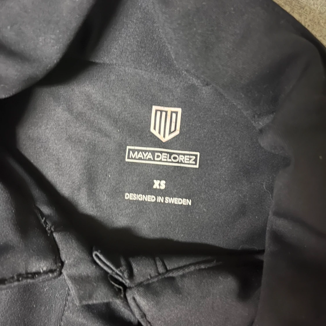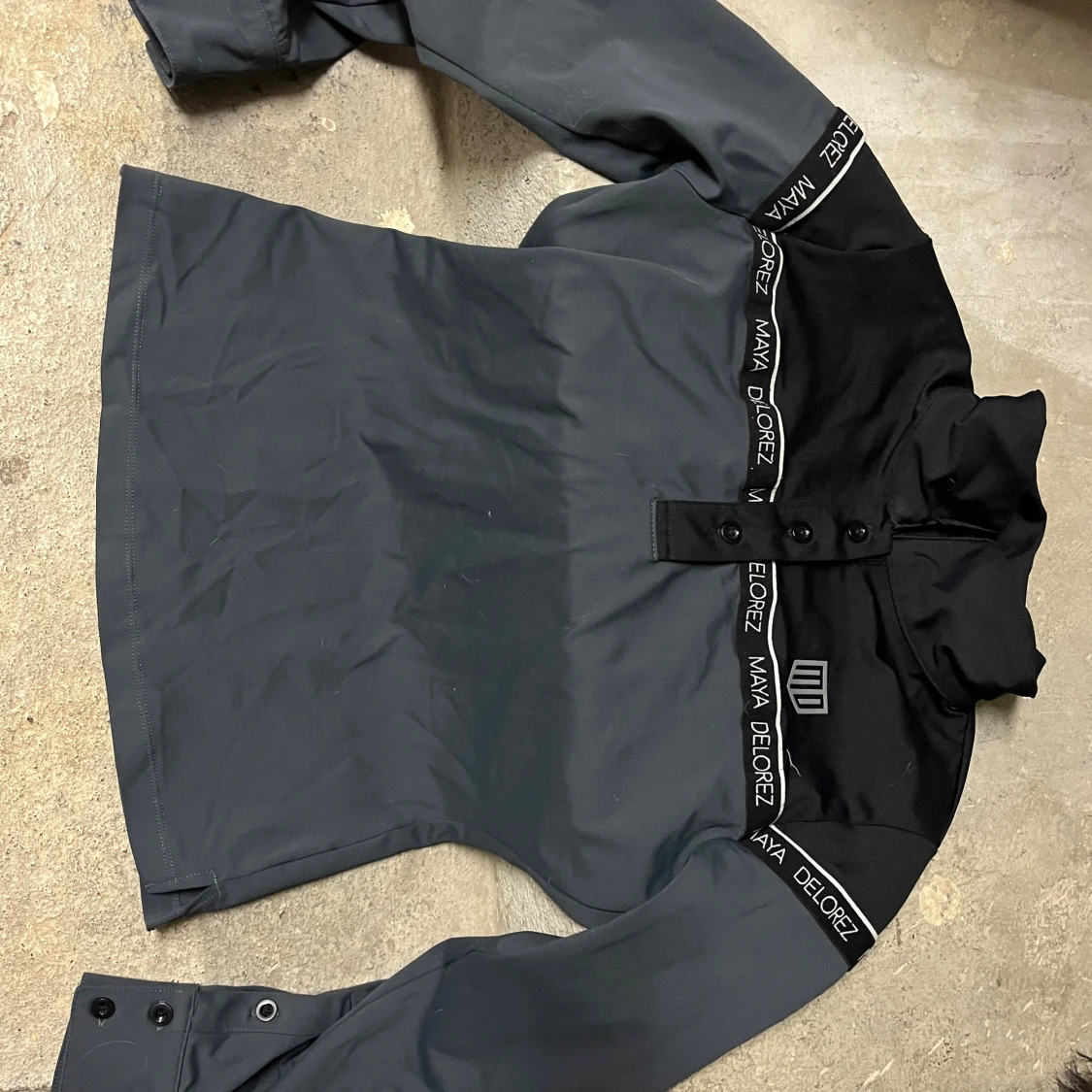 Svart långärmad tröja från Maya Delorez i storlek XS. Tröjan har hög krage, knappar framtill och detaljer med logga längs axlar och ärmslut. Snygg och sportig design som passar perfekt till ridning eller andra aktiviteter.