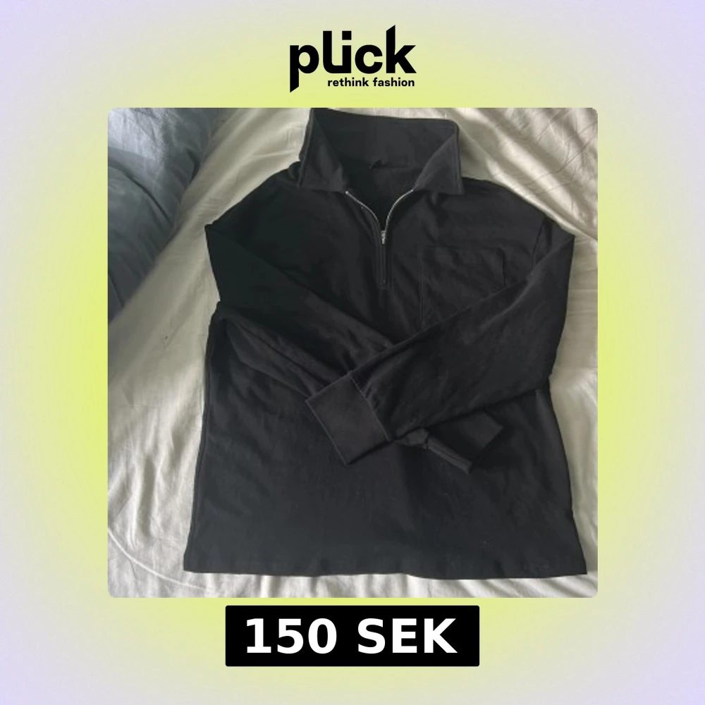 Svart långärmad tröja med krage och half zip framtill. Tröjan har en bröstficka och är tillverkad i mjukt bomullsmaterial. Tröjan har aldrig använts då den var lite förstor.