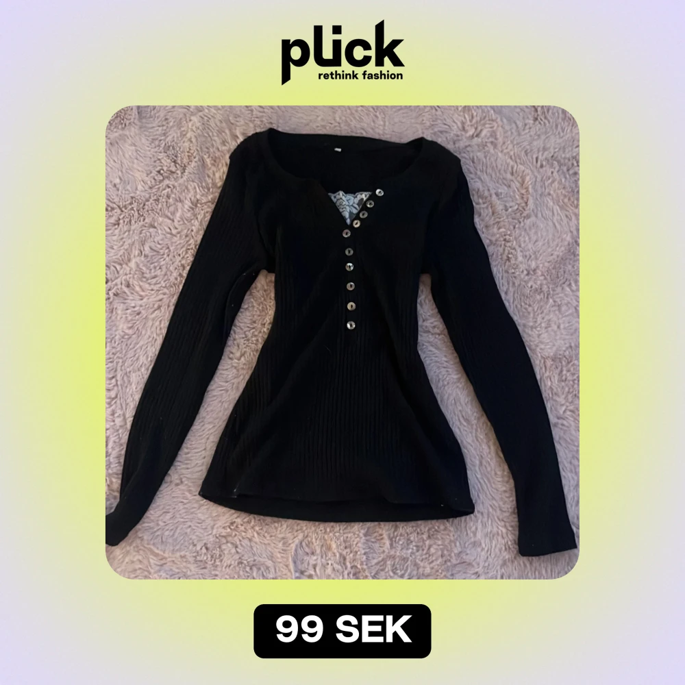Säljer en stilren svart tröja med långa ärmar och snygg v-ringning. Tröjan har dekorativa knappar framtill och en fin spetsdetalj vid halsen. Perfekt för downtown girls🖤