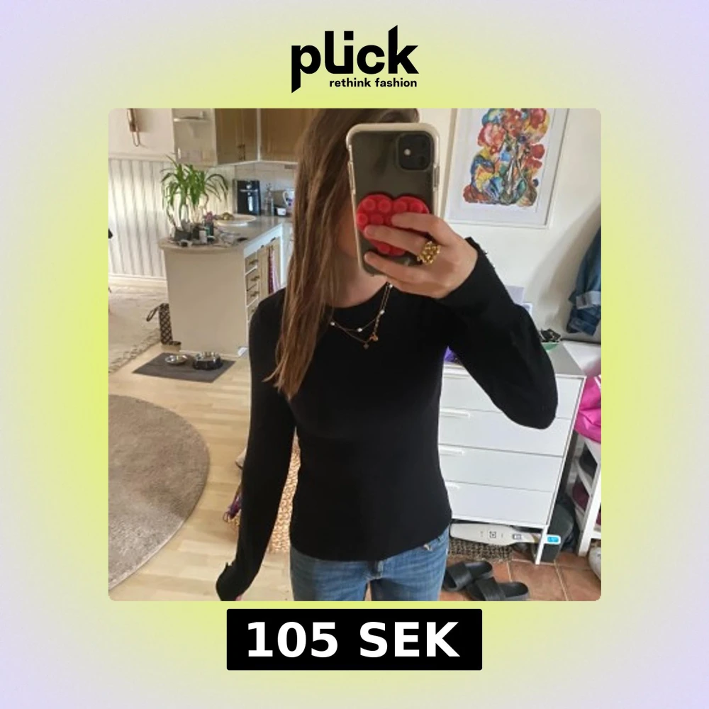 Snygg svart långärmad tröja i tight passform med silvriga knappar som detalj vid ärmsluten. Enkel och stilren modell som passar perfekt till jeans. Mjuk och skön, troligtvis i bomull eller syntet.