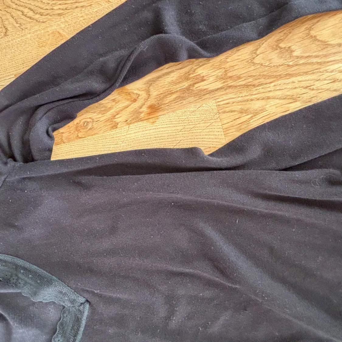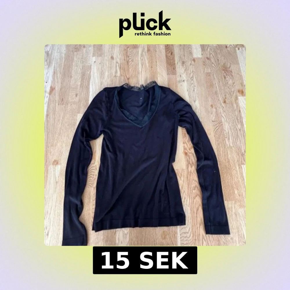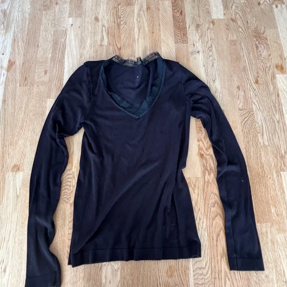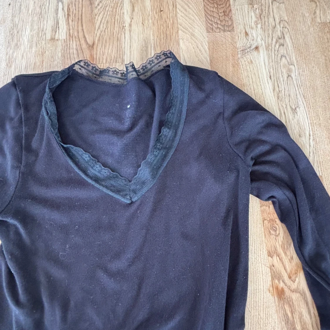 Svart långärmad tröja med v-ringad hals och snygga spetsdetaljer runt halsringningen. Mjuk och tunn, perfekt för lager på lager. Tröjan har en feminin touch med spetsen och sitter snyggt på kroppen. Passar dig som gillar stilrena och enkla plagg med en twist.
