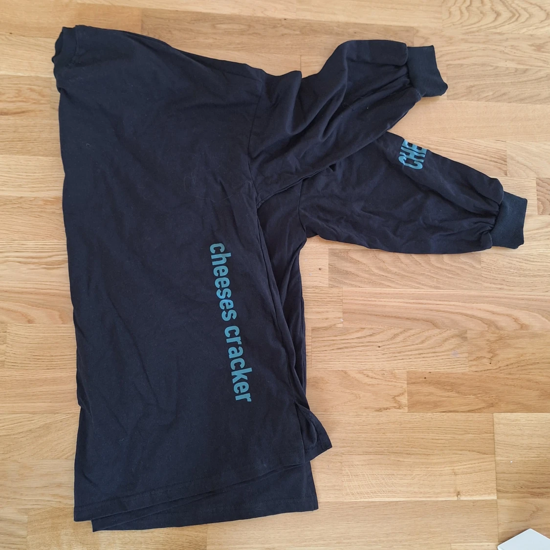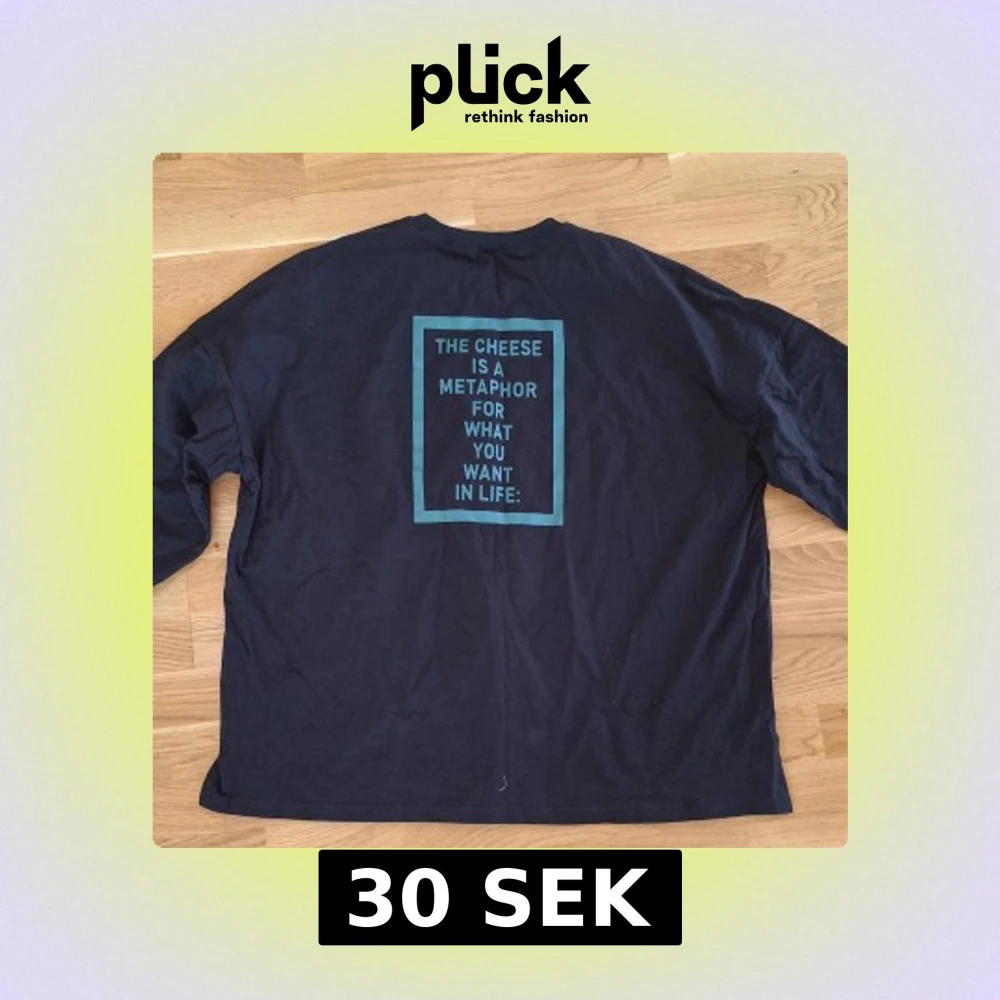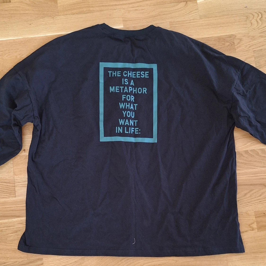 Svart långärmad tröja i bomull med blått tryck på ryggen: 'The cheese is a metaphor for what you want in life' och texten 'cheeses cracker' längs ena sidan. Tröjan har rund hals och muddar vid ärmslut. Perfekt för dig som gillar unika statement-plagg.