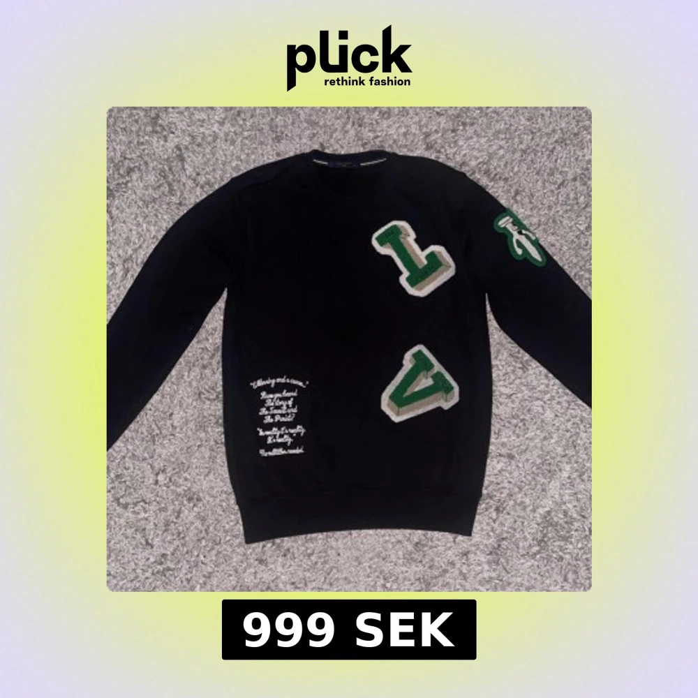 Svart sweatshirt från Louis Vuitton med stora gröna och vita LV-applikationer på framsidan och ärmen. Tröjan har rund hals, lång ärm och broderad text på nedre delen. .