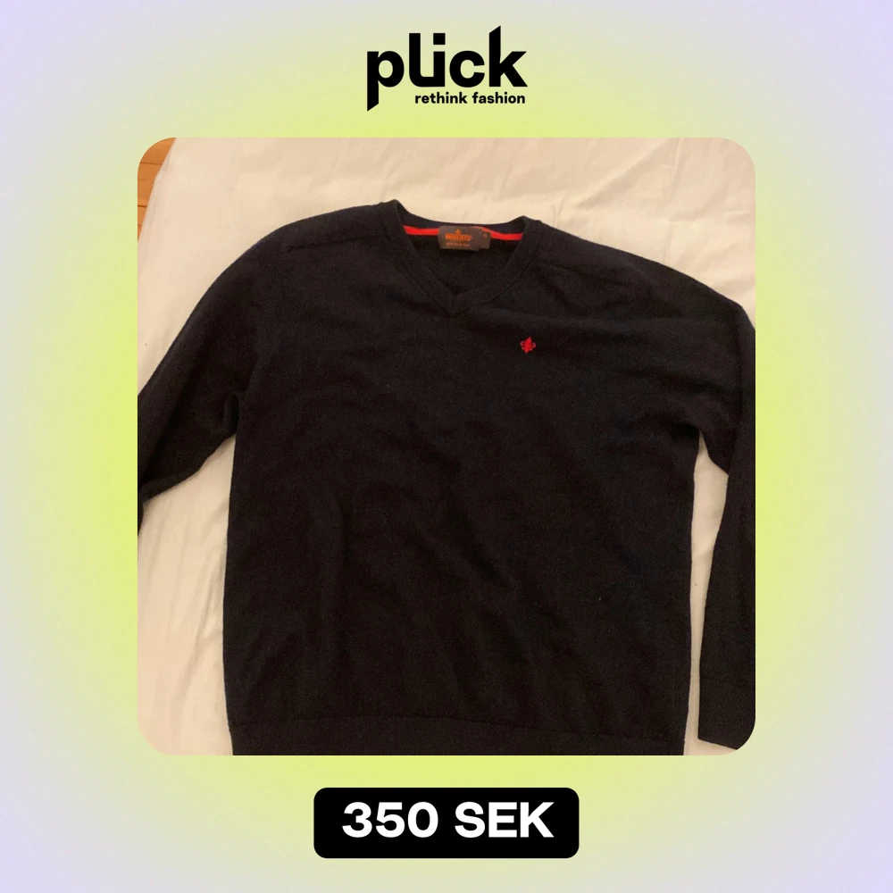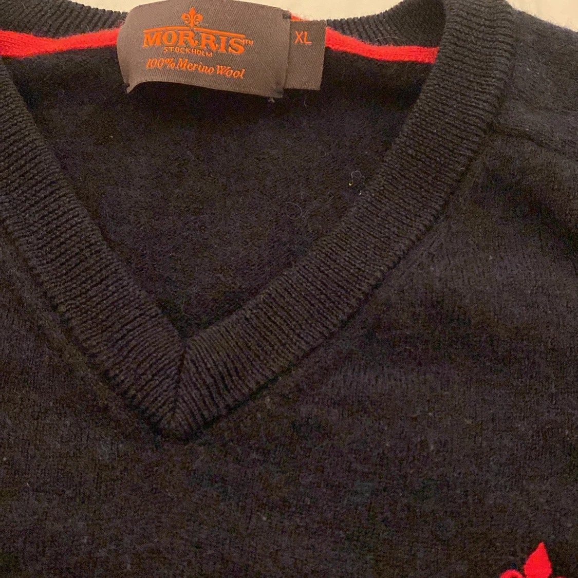Säljer en stilren svart tröja från Morris i 100% merinoull. Den har en v-ringad design och ett litet rött broderat emblem på bröstet. Perfekt för både höst och vinter, och den är i mycket bra skick. Supermjuk och varm, perfekt för kalla dagar! 🖤(original storlek är XL men har krympt i tvätten och är nu en S ungefär)