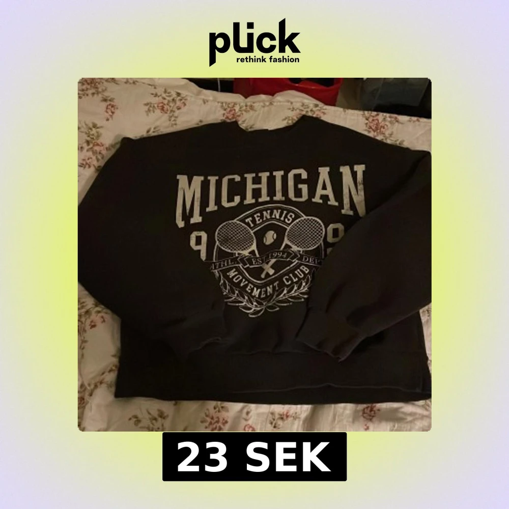Svart sweatshirt från Gina Tricot i storlek XS med stort Michigan-tryck och tennisracketar framtill. Tröjan har ribbade muddar vid hals, ärmslut och nederkant. Mjuk fleece på insidan för extra komfort. Perfekt för dig som gillar sportig och college-inspirerad stil.