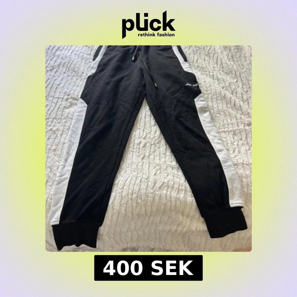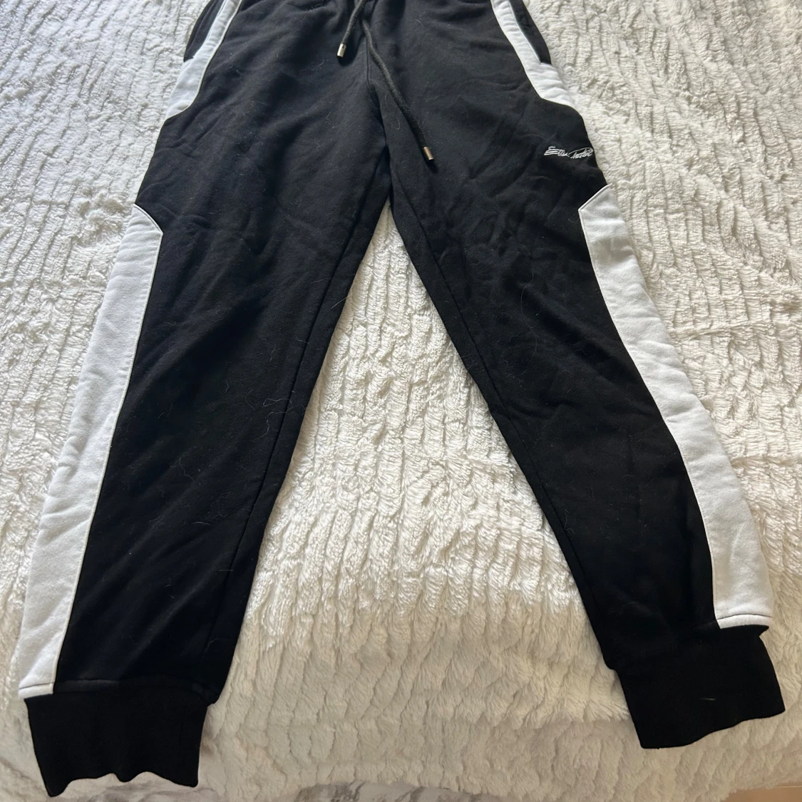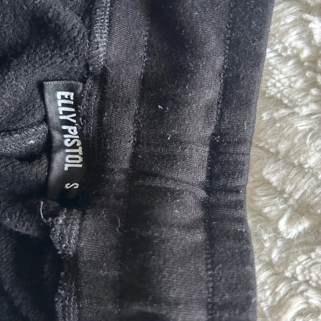 Svart mjukis sett från Elly Pistol med vita detaljer längs ärmarna och stor vit logga på ryggen. Tröjan har huva med snörning, half zip och en stor ficka framtill. Materialet är mjukt och känns som bomull, perfekt för chill eller träning. Finns att köpa för sig om man vill de istället