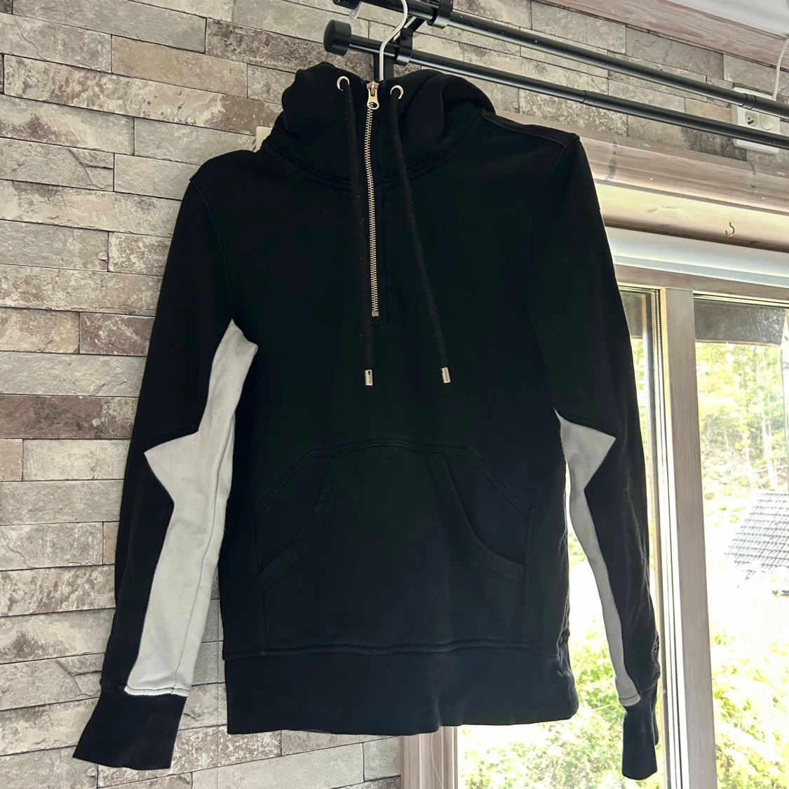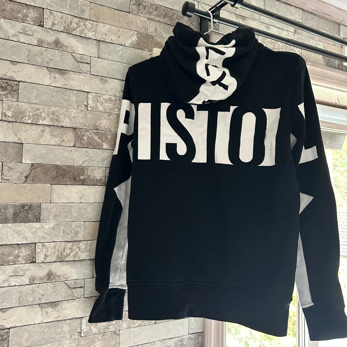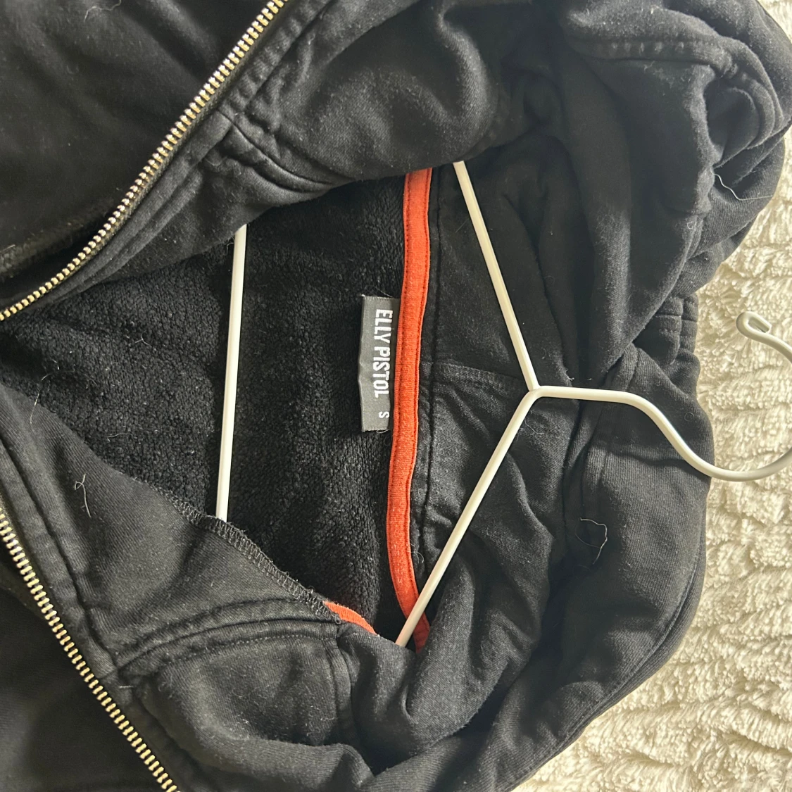 Svart mjukis sett från Elly Pistol med vita detaljer längs ärmarna och stor vit logga på ryggen. Tröjan har huva med snörning, half zip och en stor ficka framtill. Materialet är mjukt och känns som bomull, perfekt för chill eller träning. Finns att köpa för sig om man vill de istället