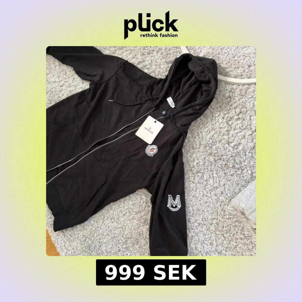 Svart hoodie från Moncler med dragkedja framtill, huva med snörning och klassisk Moncler-logga på bröstet samt ett broderat M på ärmen. Tillverkad i mjuk bomull, perfekt för en chill och stilren look.