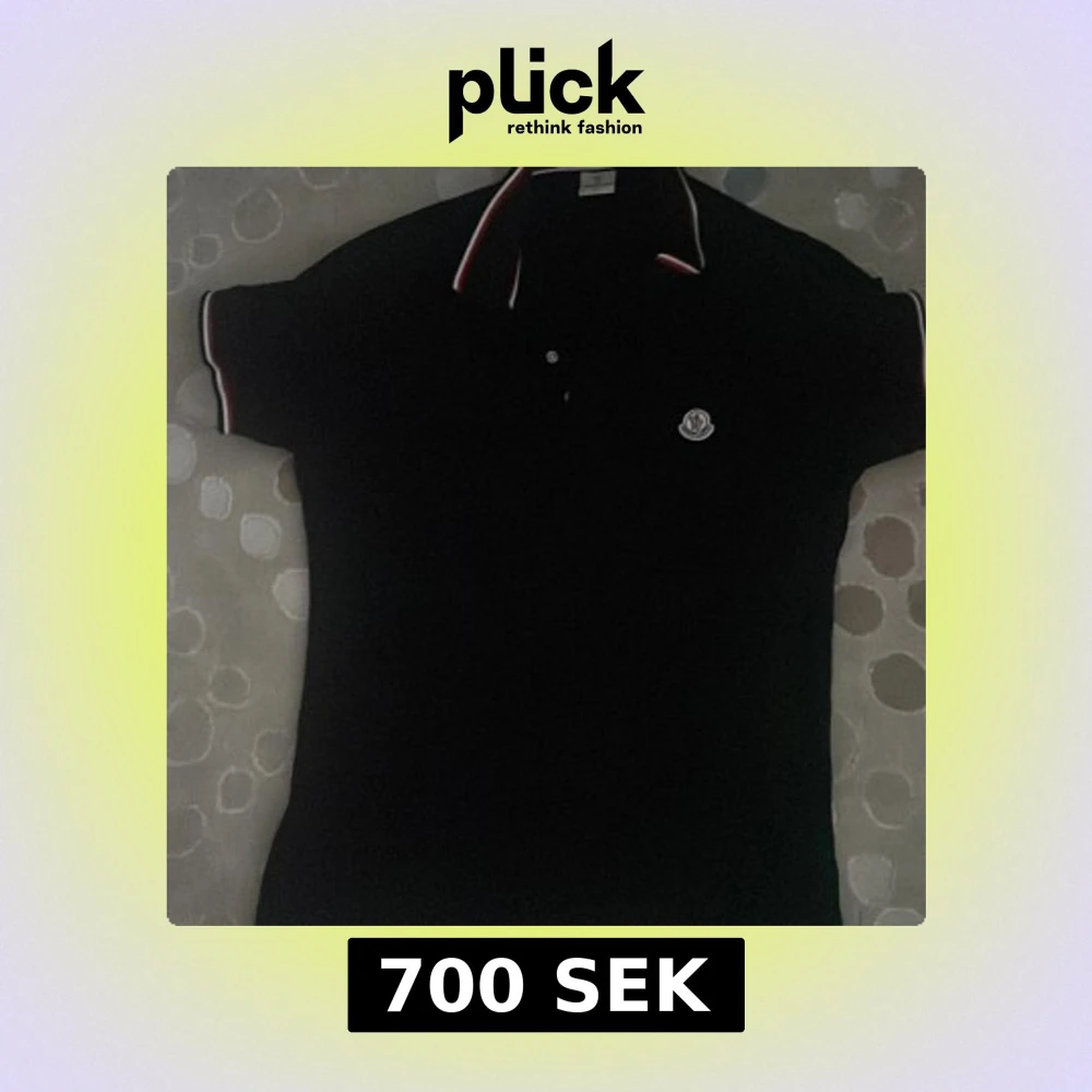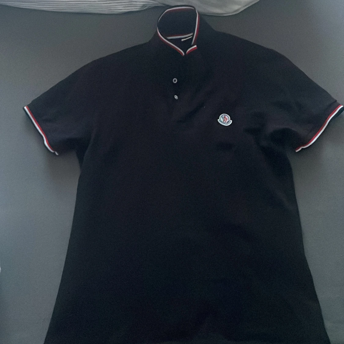 Svart pikétröja från Moncler med klassisk krage och korta ärmar. Tröjan har vita och röda ränder på krage och ärmslut samt Moncler-logga på bröstet. Snygg och stilren modell i mjuk bomull, perfekt för dig som gillar exklusiva märken och sportig vibe.
