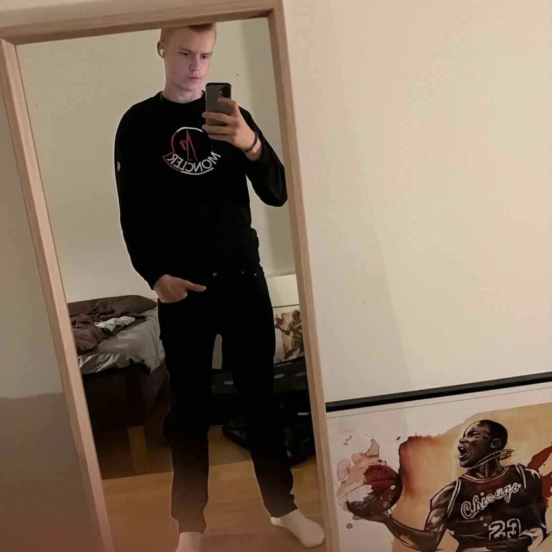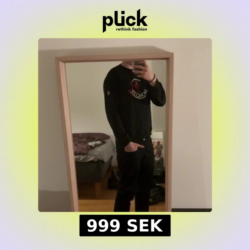 Svart sweatshirt från Moncler med stor logga i rött och vitt på bröstet. Tröjan har rund halsringning, långa ärmar och ribbade muddar. Perfekt för dig som gillar stilrena och exklusiva plagg.