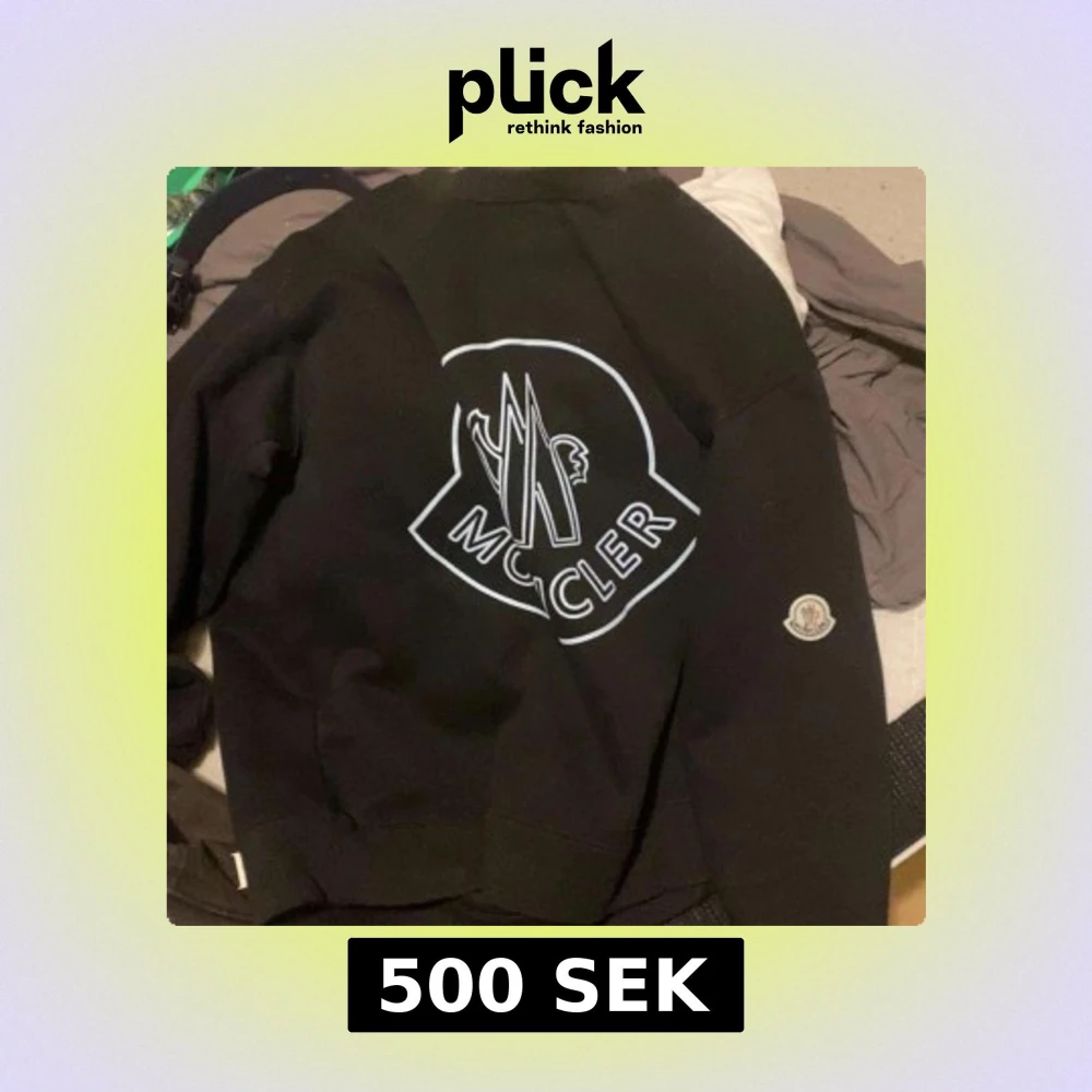 Svart sweatshirt från Moncler med stor vit logga på ryggen och klassisk Moncler-patch på ärmen. Tröjan har en avslappnad passform och är tillverkad i mjuk bomull, perfekt för en stilren och trendig look.