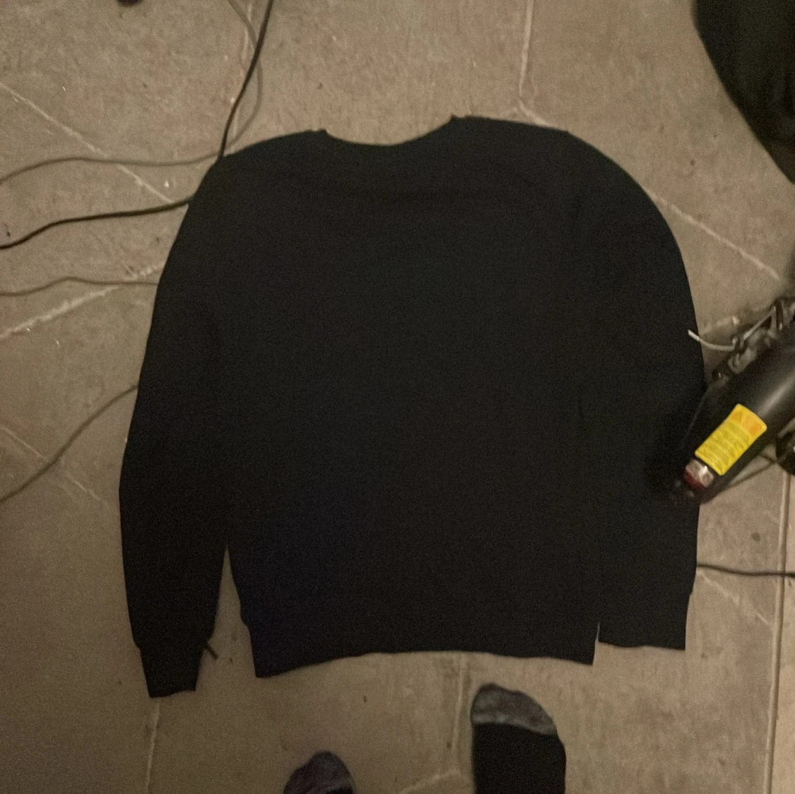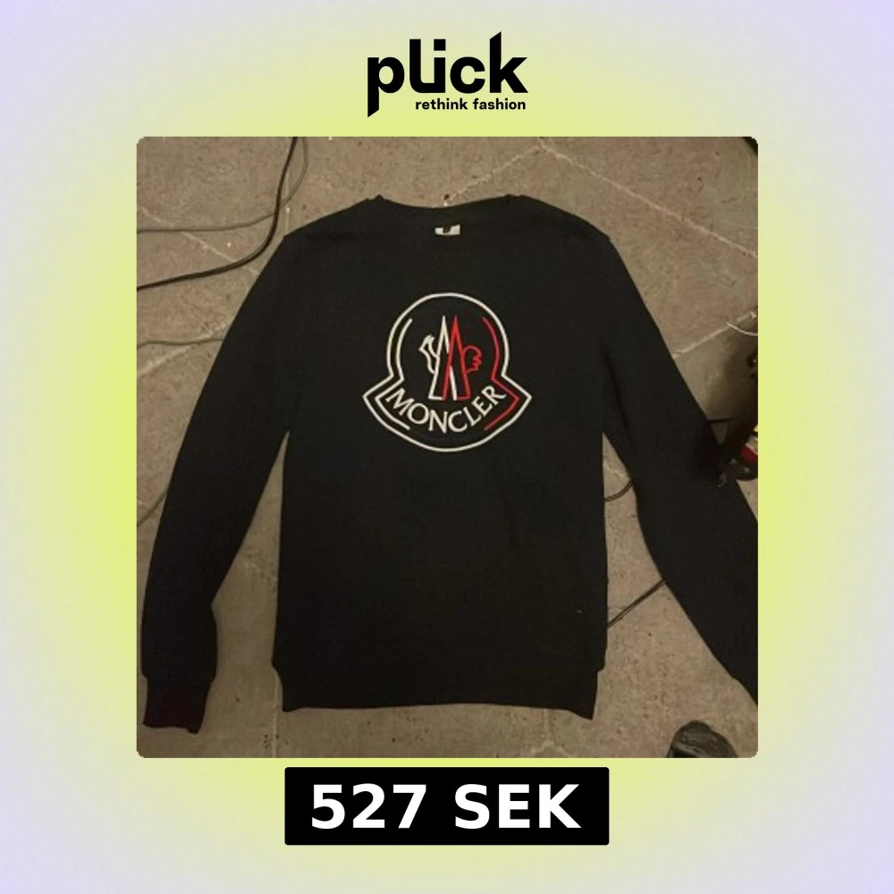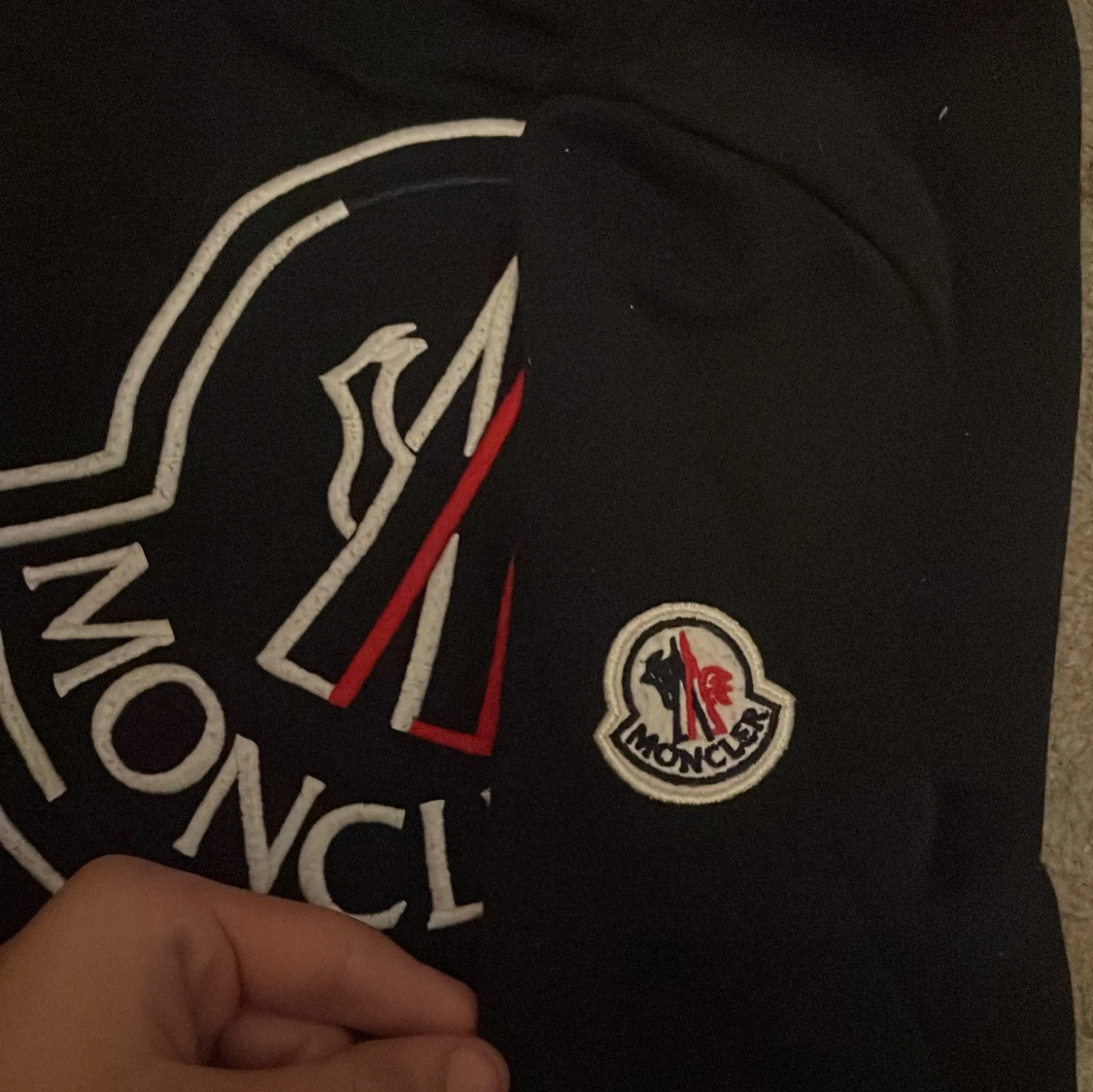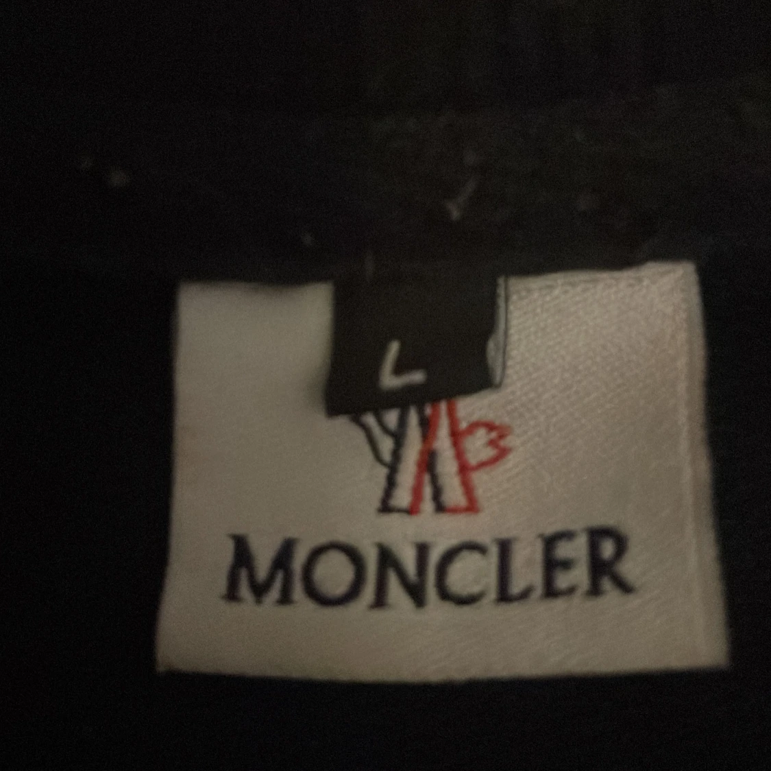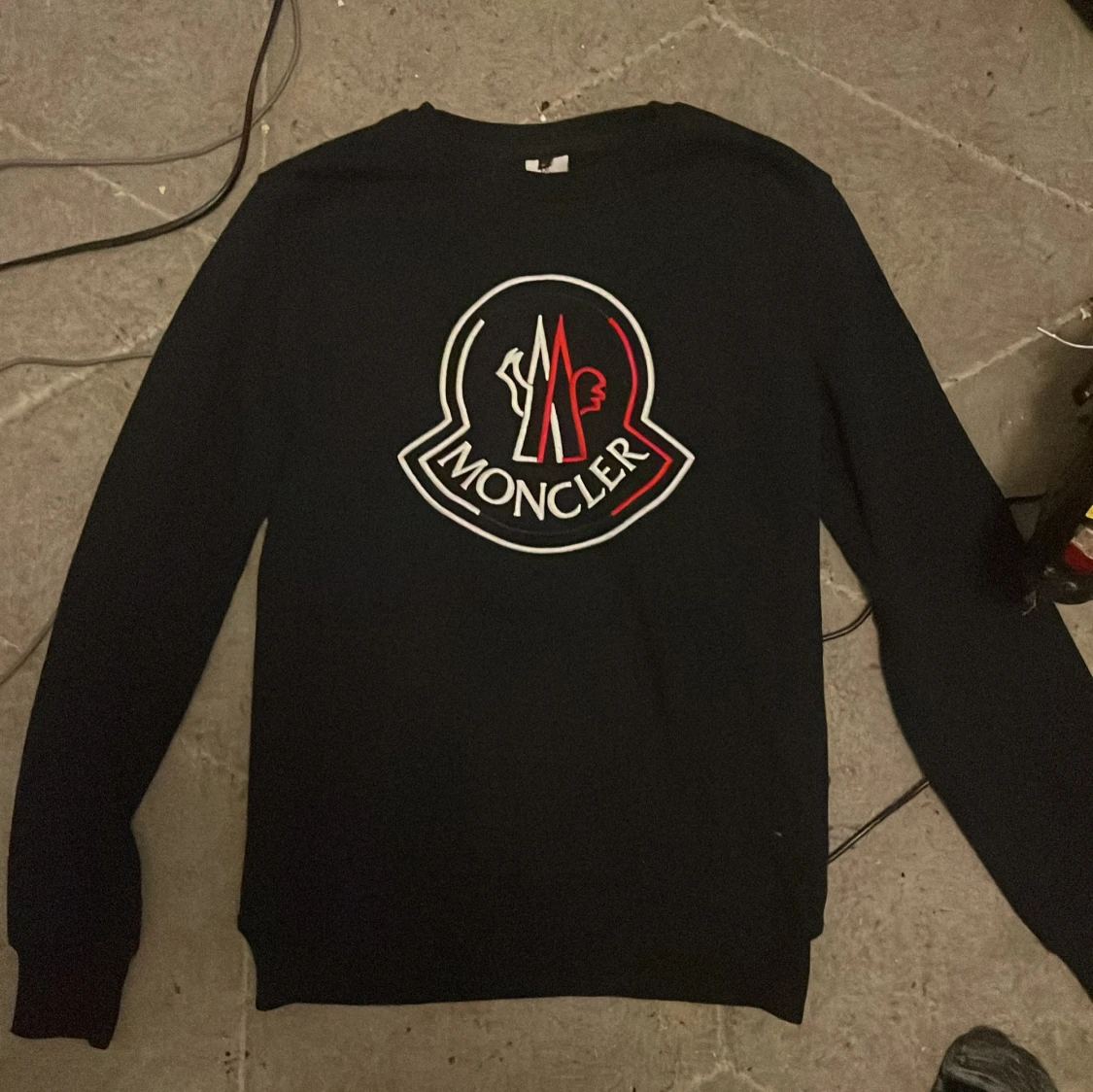Svart långärmad tröja från Moncler med stor broderad logga i vitt och rött på bröstet samt en mindre logga på ärmen. Klassisk rund halsringning och ribbade muddar. Perfekt för dig som gillar streetwear och vill sticka ut med en ikonisk design. Storlek L men passar mig som har S