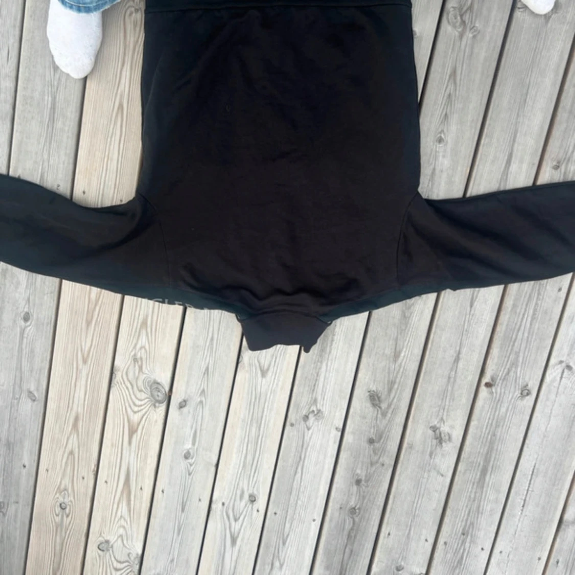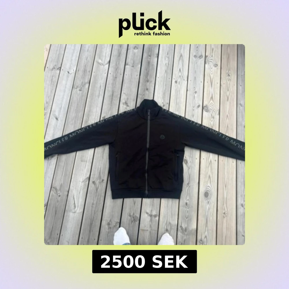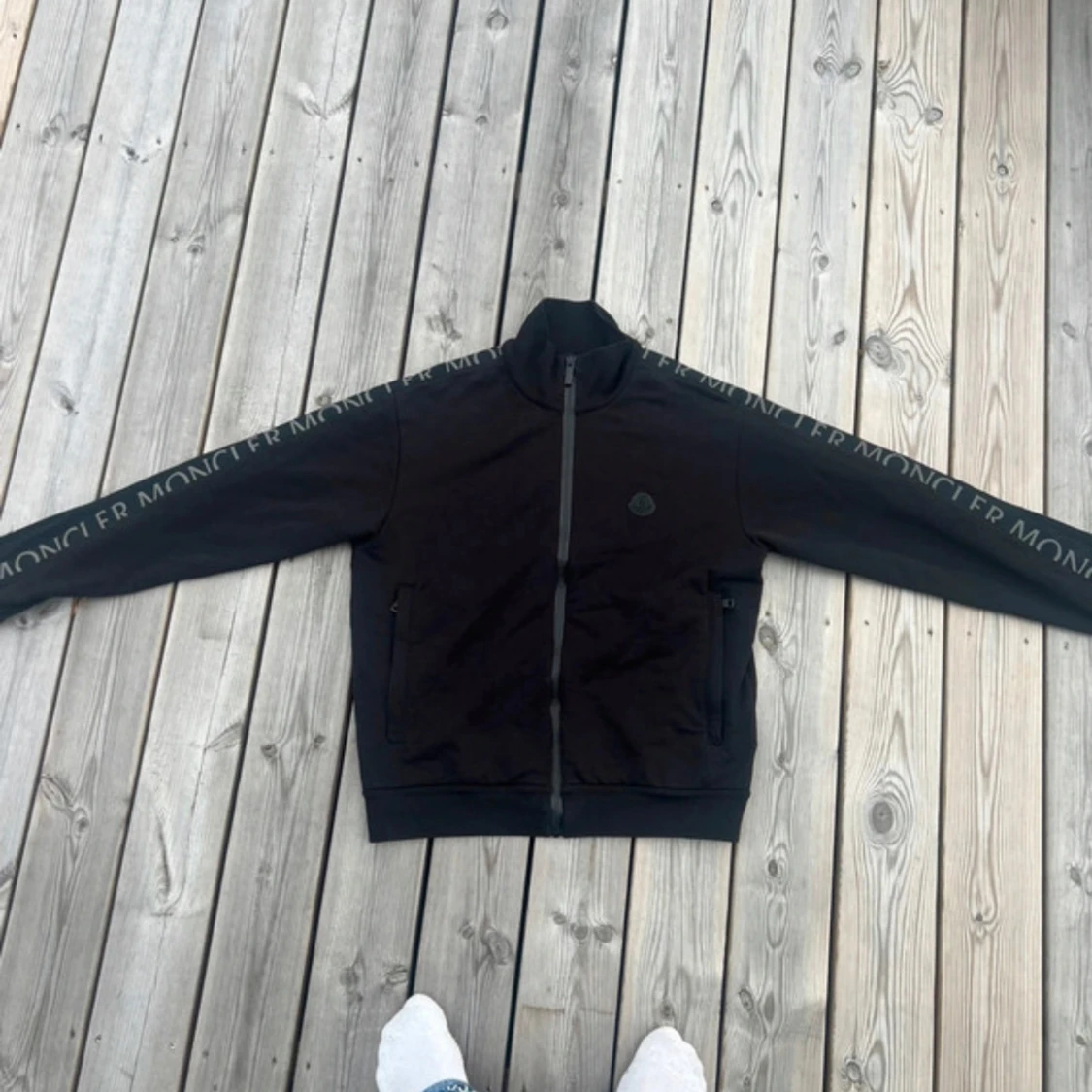 DEN ÄR ÄKTA! Pris kan diskuteras vid snabb affär!! Använd fåtal gånger!! Svart kofta från Moncler med dragkedja framtill och Moncler-logga på bröstet. Snygga detaljer med Moncler-tryck längs ärmarna och två fickor med dragkedja. Koftan har hög krage och är tillverkad i mjukt bomullsmaterial.