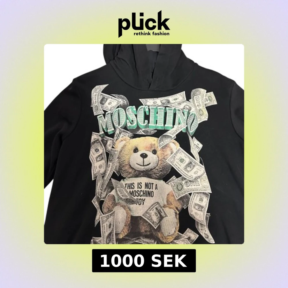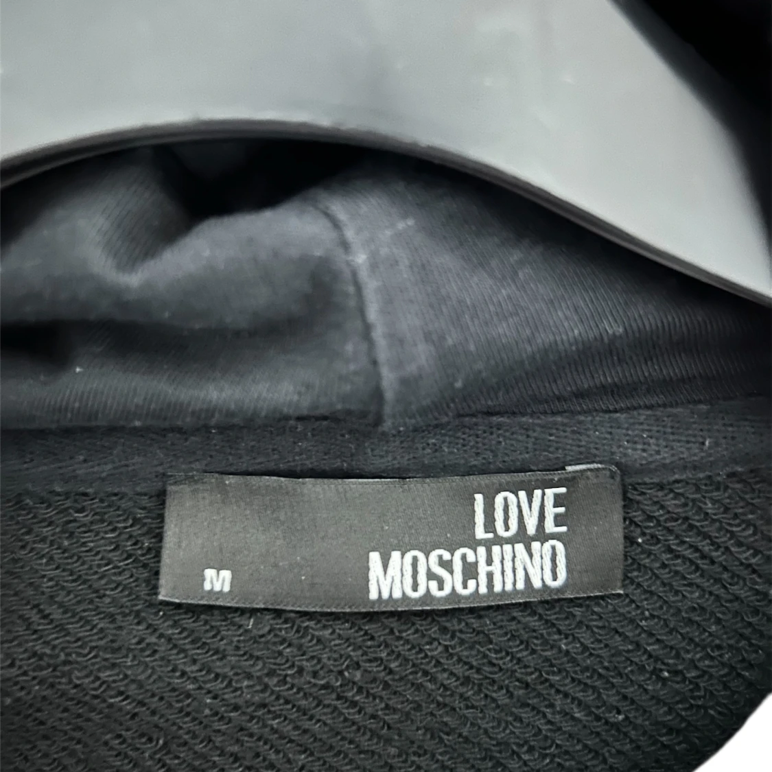 Svart hoodie från Love Moschino med stort tryck av en nalle, dollar bills och texten 'This is not a Moschino toy' på framsidan. Tröjan har huva och långa ärmar, perfekt för dig som gillar statement-plagg och streetstyle.