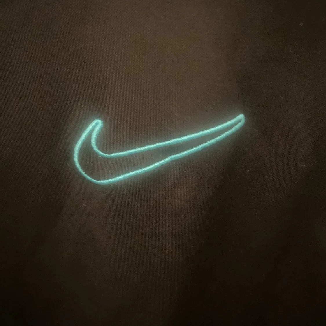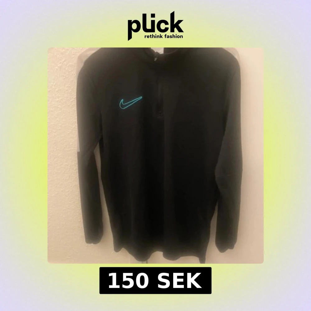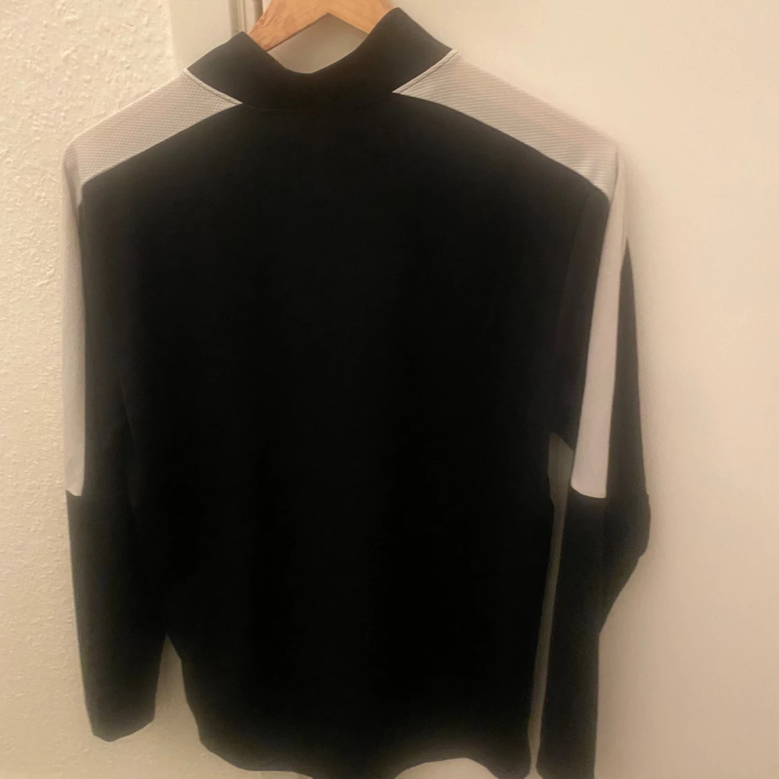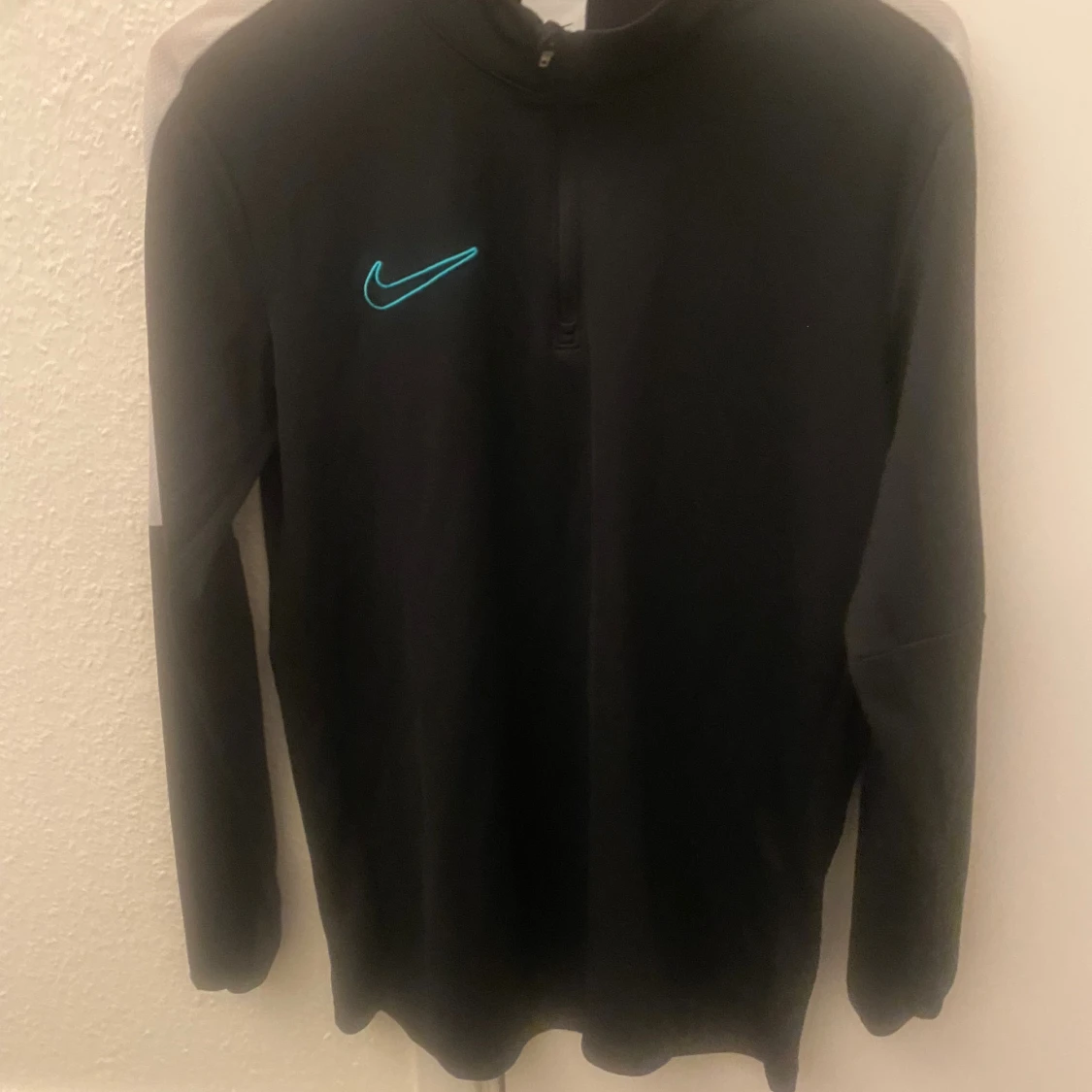 Svart långärmad Nike Dri-Fit tröja med halv dragkedja och turkos broderad swoosh på bröstet. Tröjan har vita paneler på axlar och ärmar, perfekt för träning eller chill. Tillverkad i funktionsmaterial som andas och transporterar bort fukt. Från JD