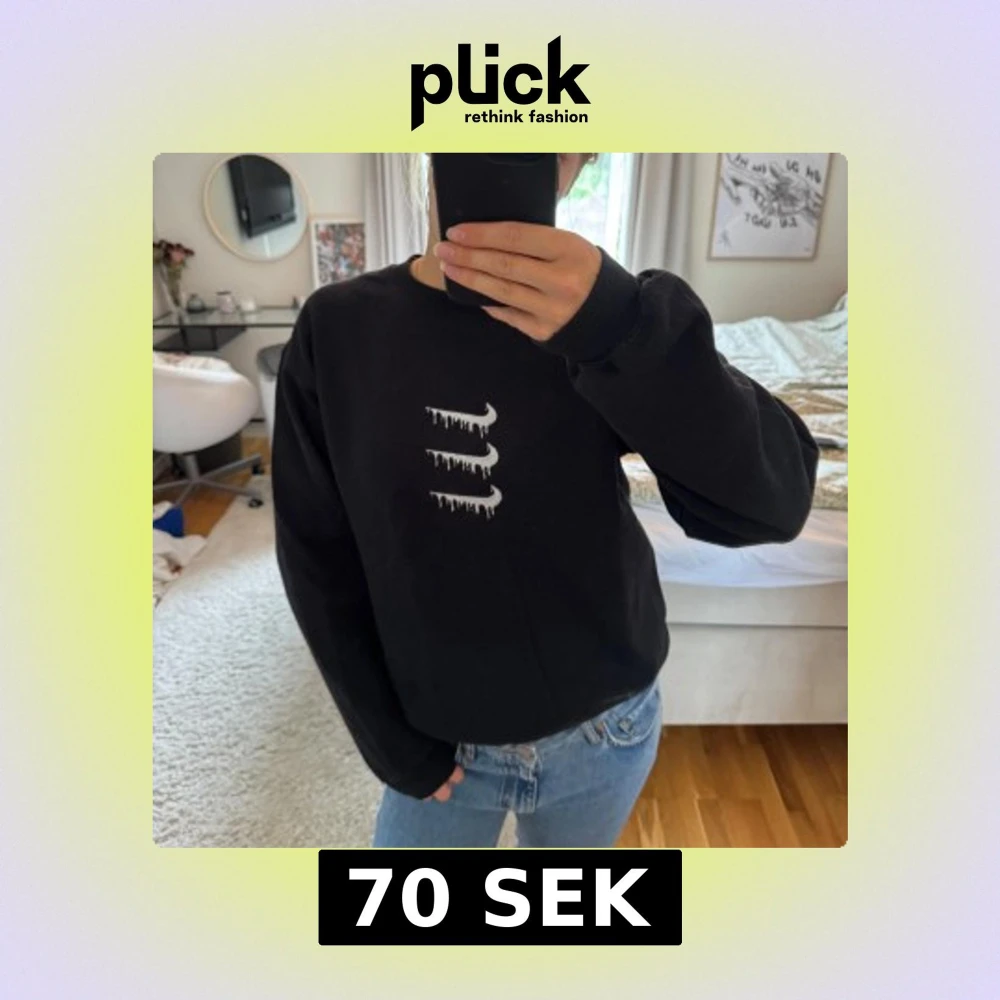 Svart sweatshirt från Nike med tre vita drip-Swoosh loggor på bröstet. Klassisk rund halsringning och långa ärmar.😇