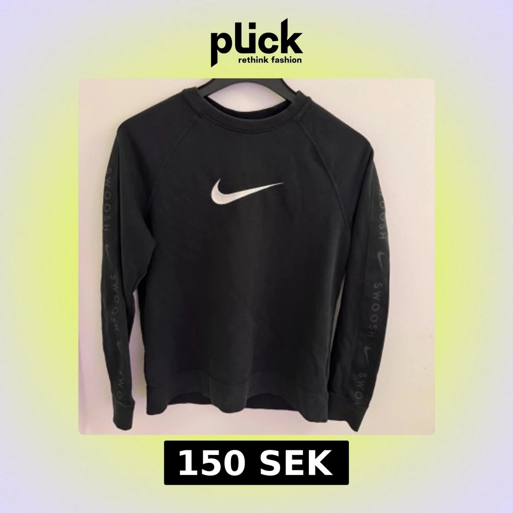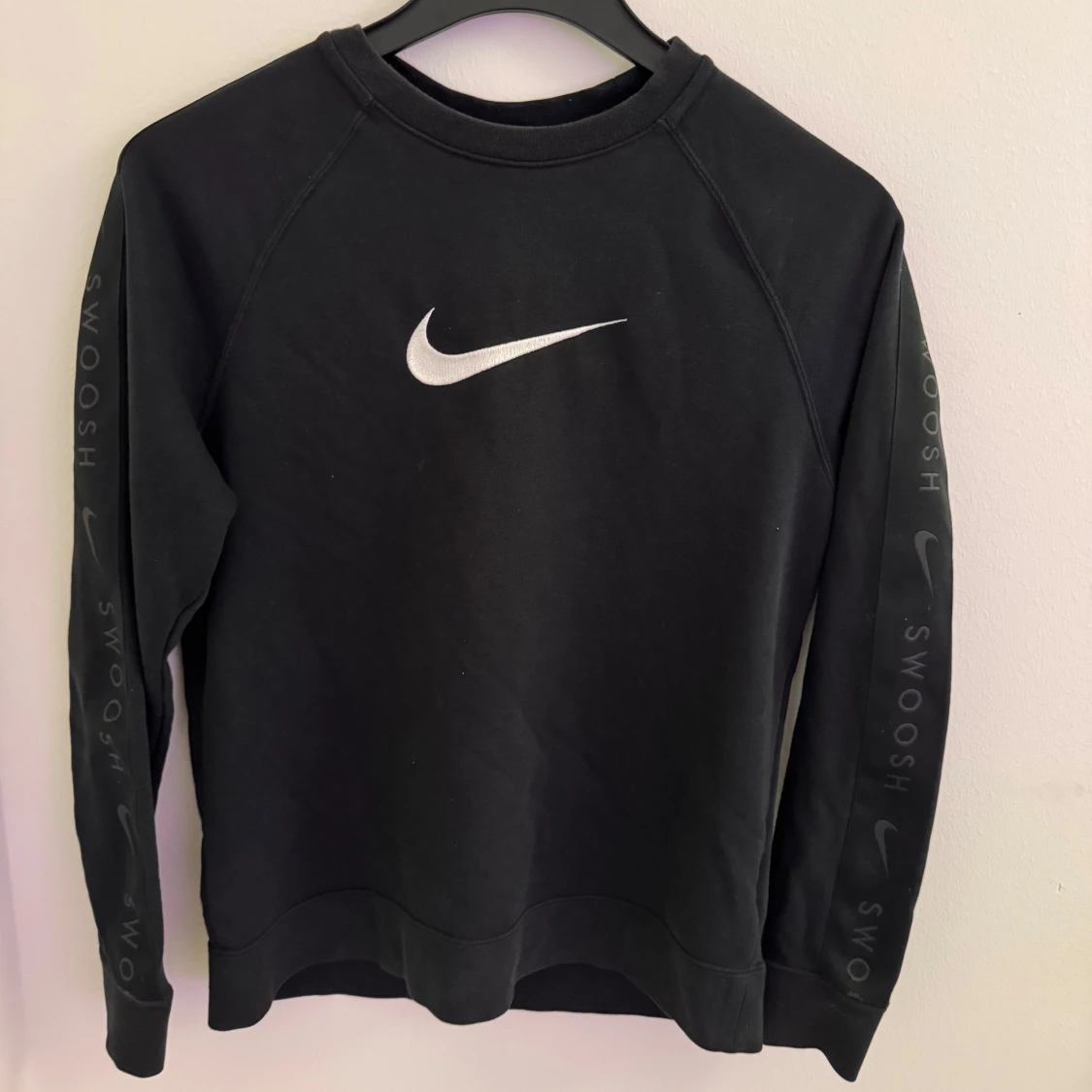 Svart sweatshirt från Nike med stor vit Swoosh-logga på bröstet och texten 'Swoosh' längs båda ärmarna. Klassisk rund halsringning och långa ärmar. Perfekt för en sportig och avslappnad stil. Den är i storlek Xl men tycker att den verkar vara mindre jag har S och brukar ha den som en oversized tröja