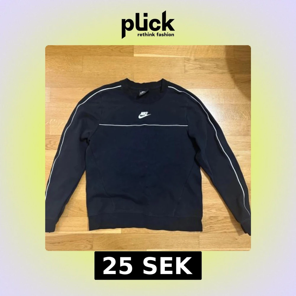 Snygg svart sweatshirt från Nike med vita ränder längs ärmarna och en vit logga på bröstet. Tröjan har rund halsringning och långa ärmar. Perfekt för en sportig och avslappnad stil.
