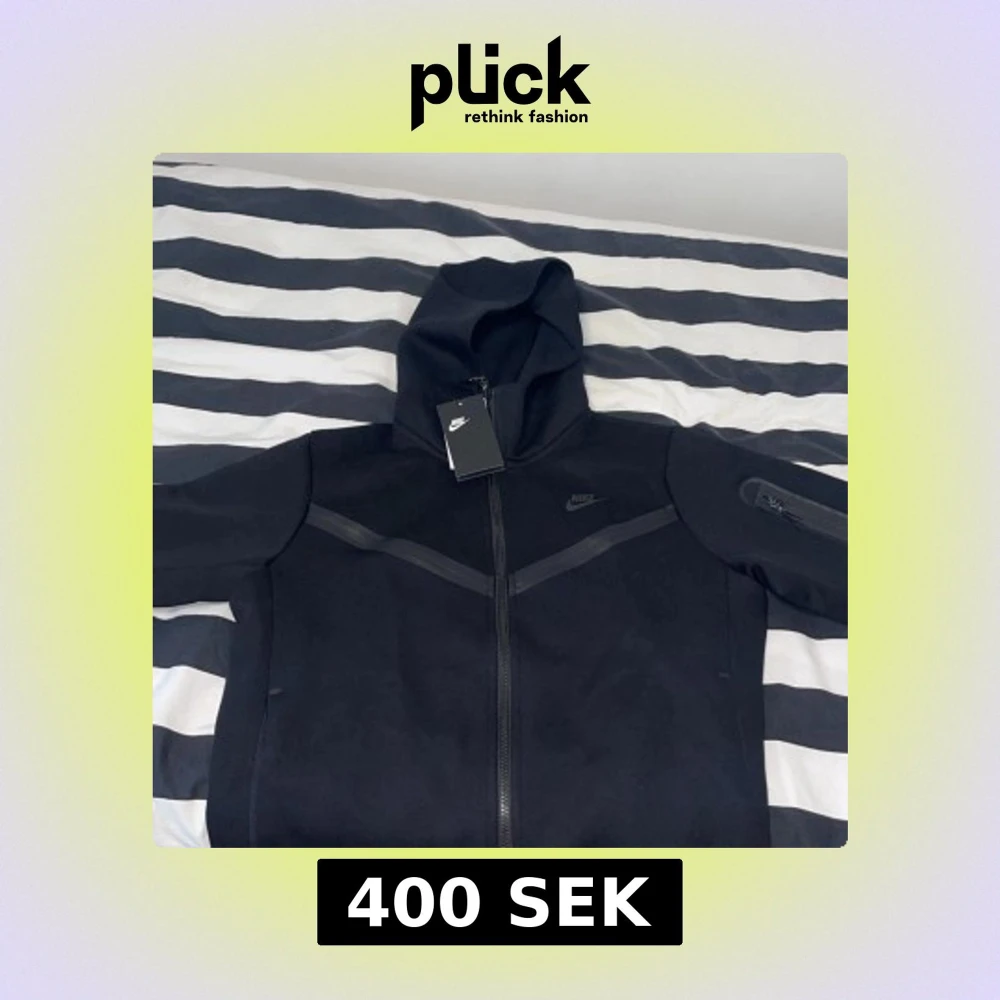Säljer en svart hoodiejacka från Nike med dragkedja och huva. Jackan har en diskret Nike-logga på bröstet och en praktisk ficka med dragkedja på ärmen. Lite mer loose fit. Storlek M.