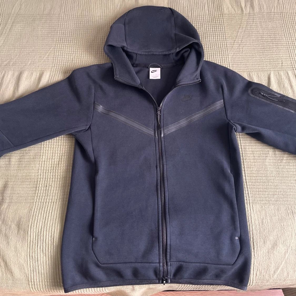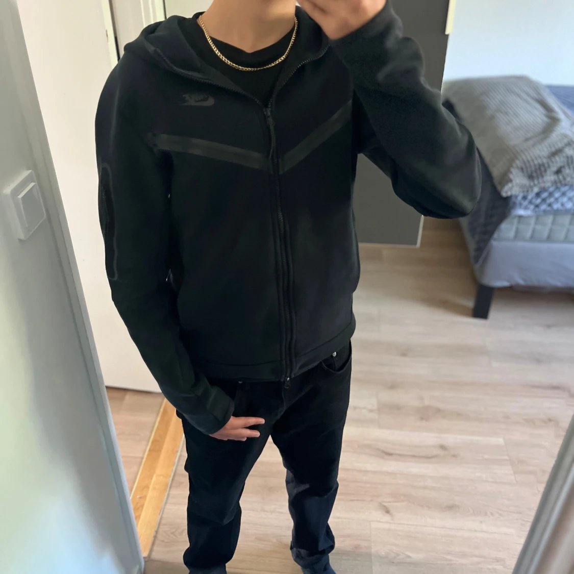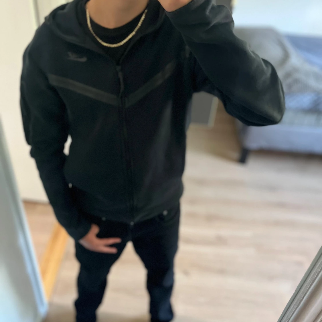 Svart hoodie från Nike i storlek XS med hel dragkedja och huva. Snygga detaljer med diskreta svarta ränder över bröstet och ficka med dragkedja på ärmen. Perfekt för dig som gillar sportig och clean stil. Bra skick.